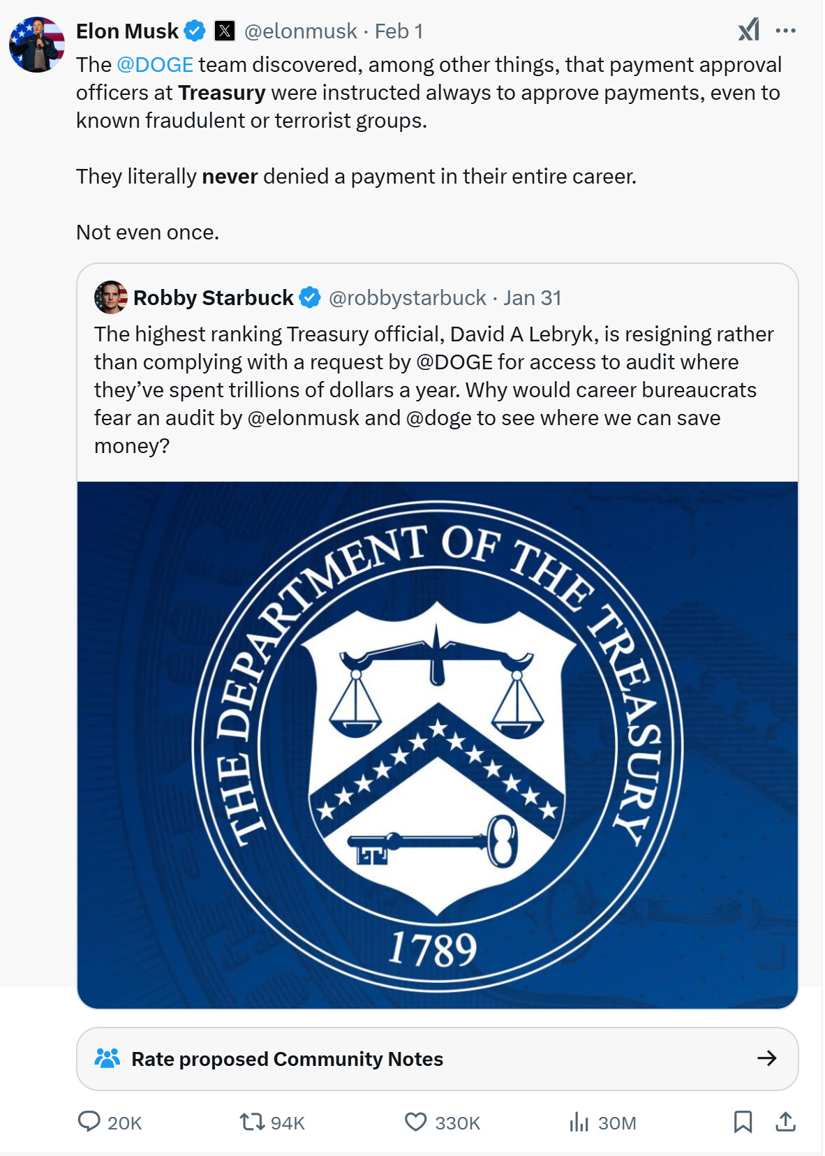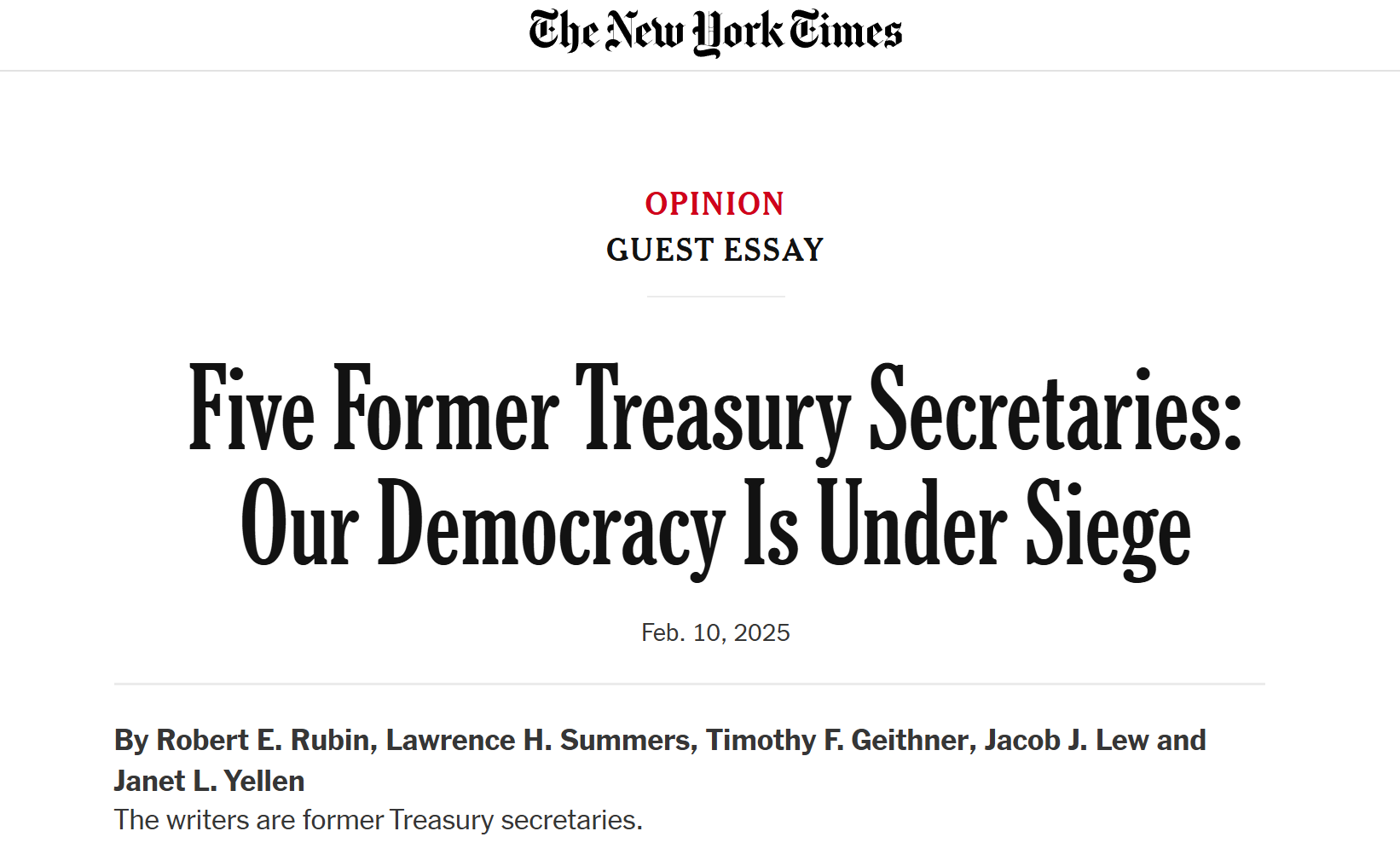 “In recent days, that norm has been upended, and the roles of these nonpartisan officials have been compromised by political actors from the so-called Department of Government Efficiency. One has been appointed fiscal assistant secretary—a post that for the prior eight decades had been reserved exclusively for civil servants to ensure impartiality and public confidence in the handling and payment of federal funds.”