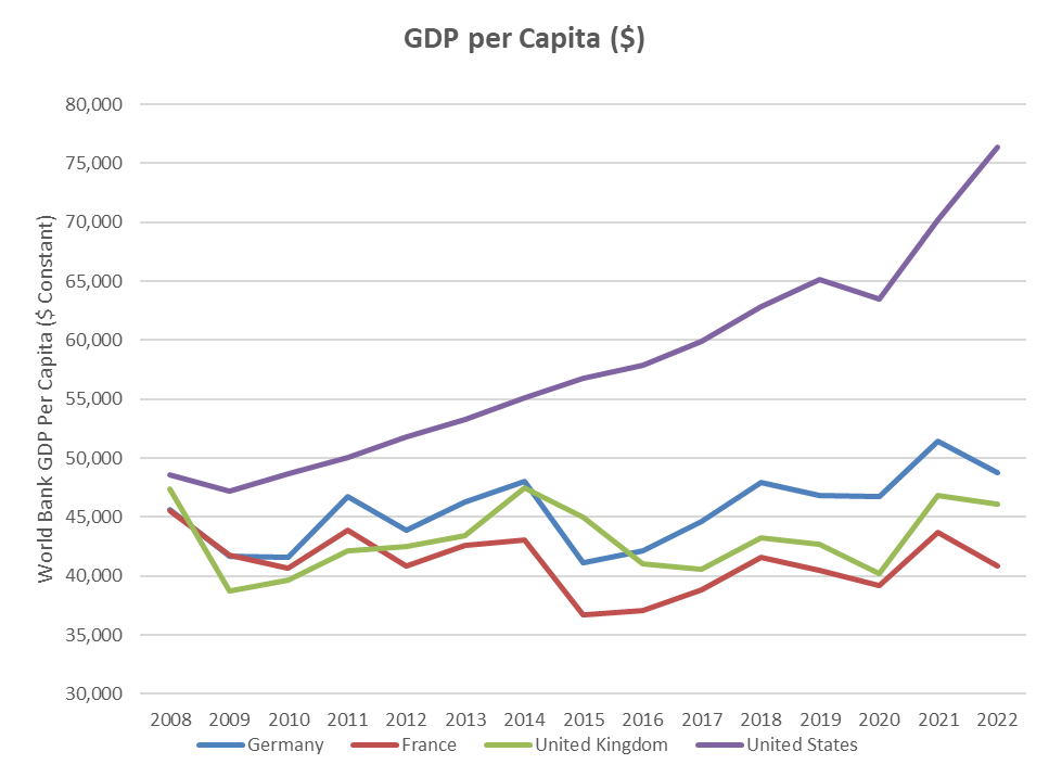 it’s easy to see the stagnation that awaits from an EU style system, but what’s difficult to see is what has been left on the table in the US from the “growth that never was” as the damage of rule makers and awful fiscal and monetary policy.