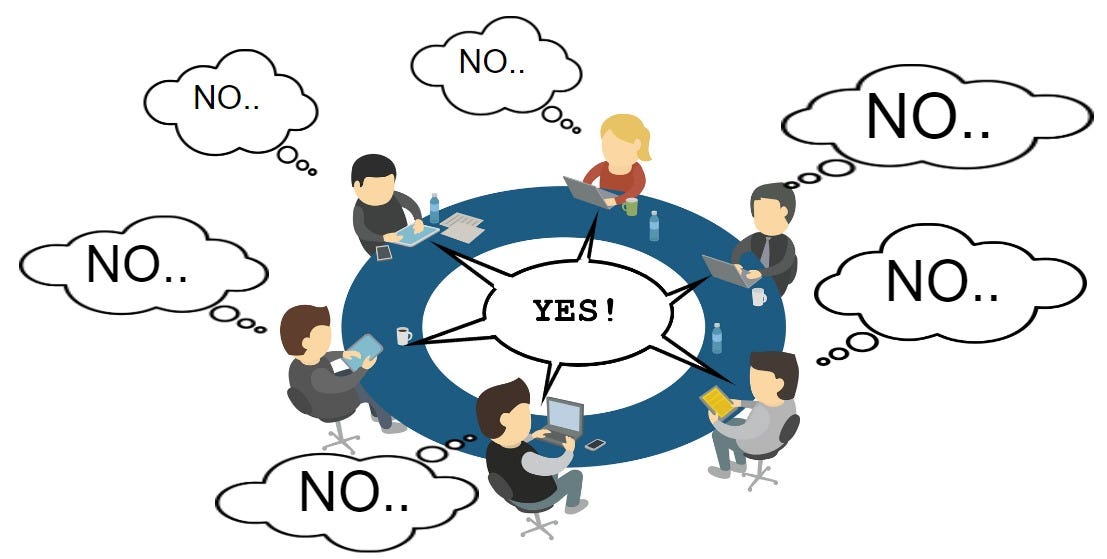 i have spoken in the past about abilene paradoxes, an odd state of affairs where a group of people almost all thinks “not X” but agrees to “X” because each person in the group thinks that all the others think “X” and fail the asch conformity test to stand up for their real thoughts, knuckling under to the crowd and presuming themselves to be somehow defective or an outlier.