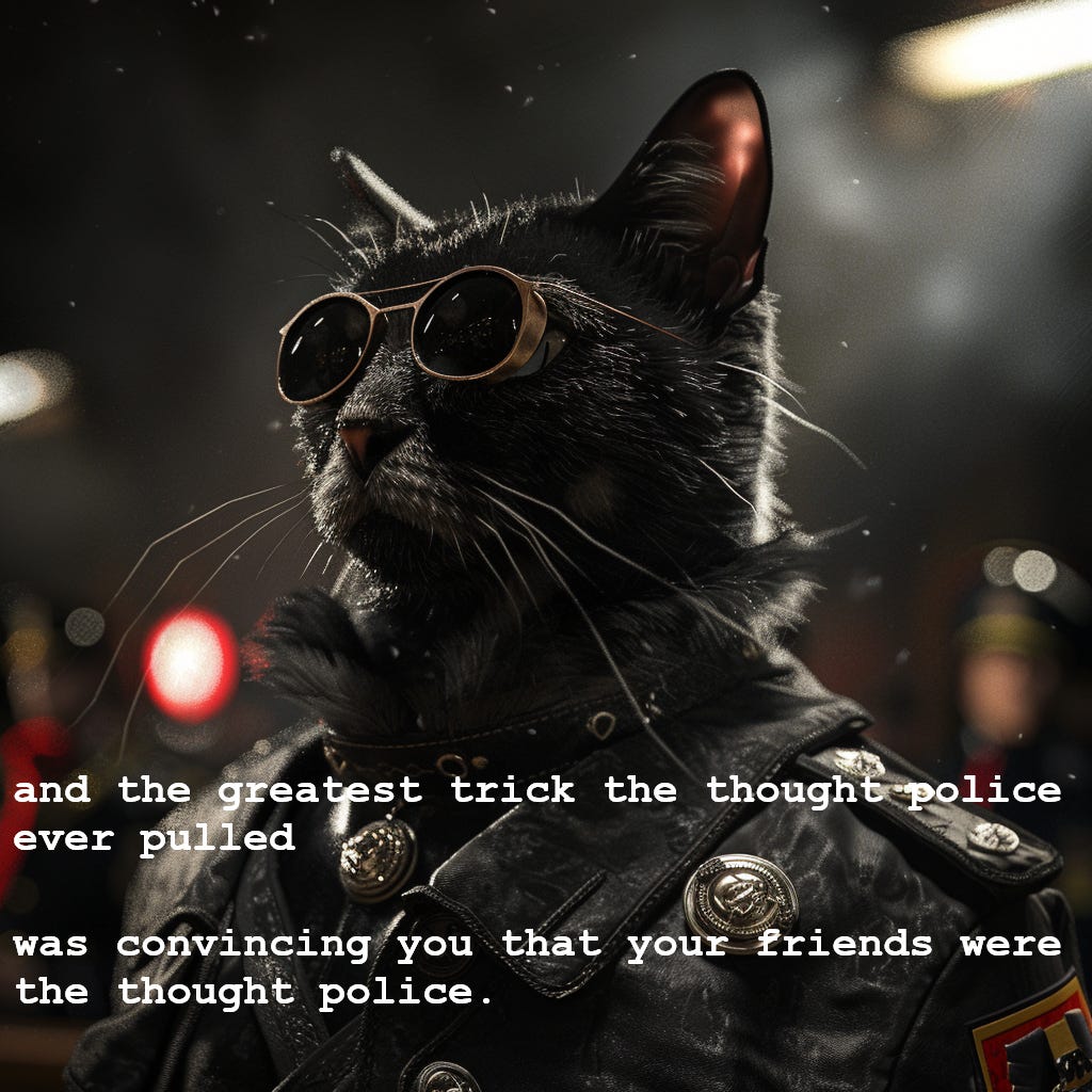 it is the collective performance of these absurdist tenets that keeps the others inside the fence, rendering us the wardens of one another in some sort of society scale prison experiment: each and all terrified that those around them may be the thought police and unable to find fellowship for fear of visits from the intellectual stasi or of being morally and socially isolated or ostracized or deemed stupid or defective.