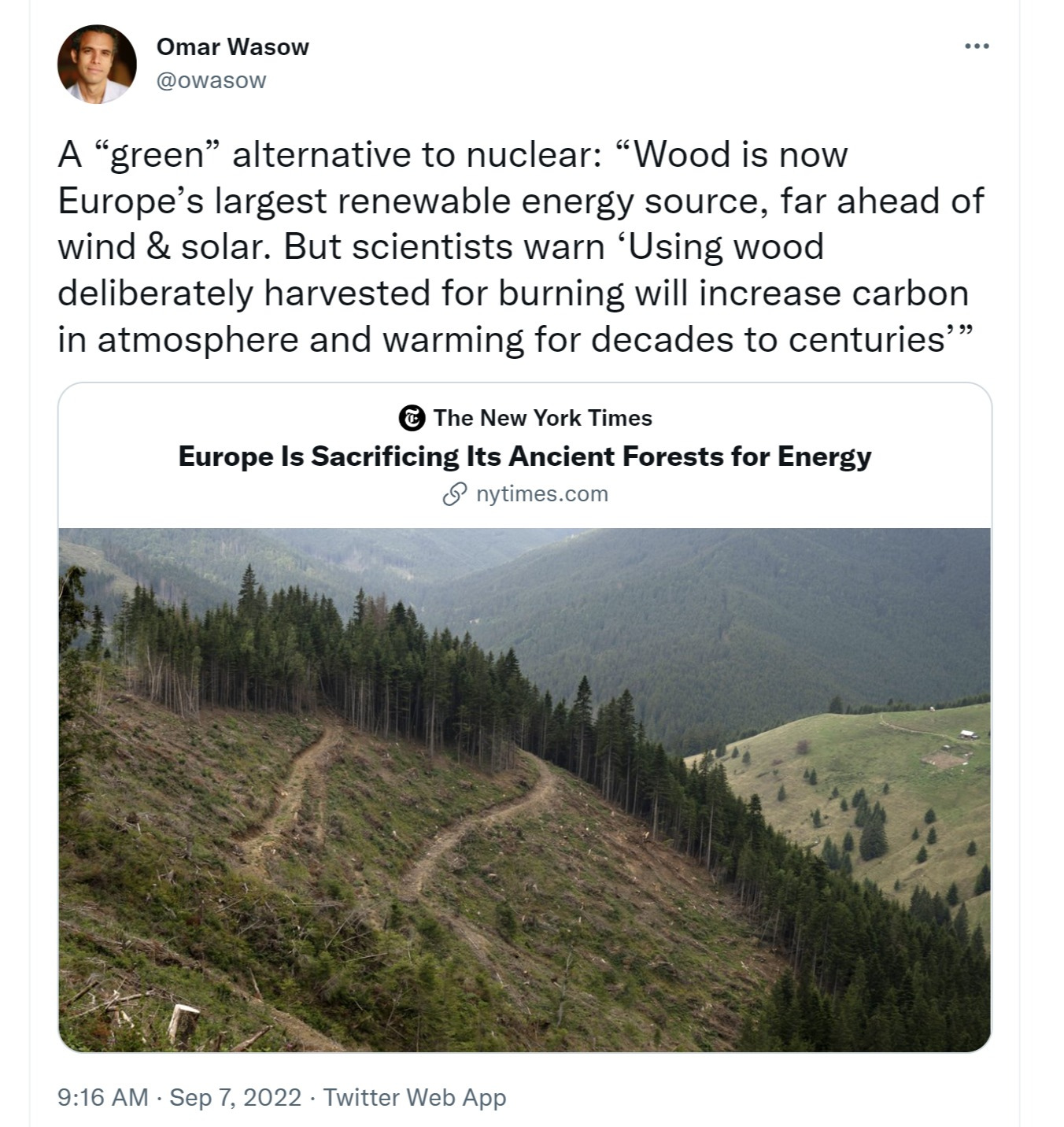 cut down trees that took decades to grow, chip them, often ship this to the EU from america, then burn the wood is a huge loser. wood is incredibly high carbon. burning it produces more CO2 than even coal and the CO2 in a tree is released all at once and takes decades to recapture through regrowth and by then, you’ll have deforested europe. adding 3% to global energy from wood would double global annual forest cuttings from current levels. this is a complete scam and the absurdity of the chemical and eco claims is ably laid out by longtime gatopal™ doomberg.