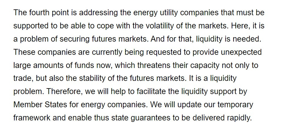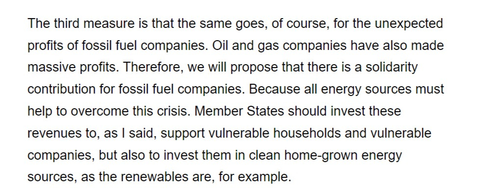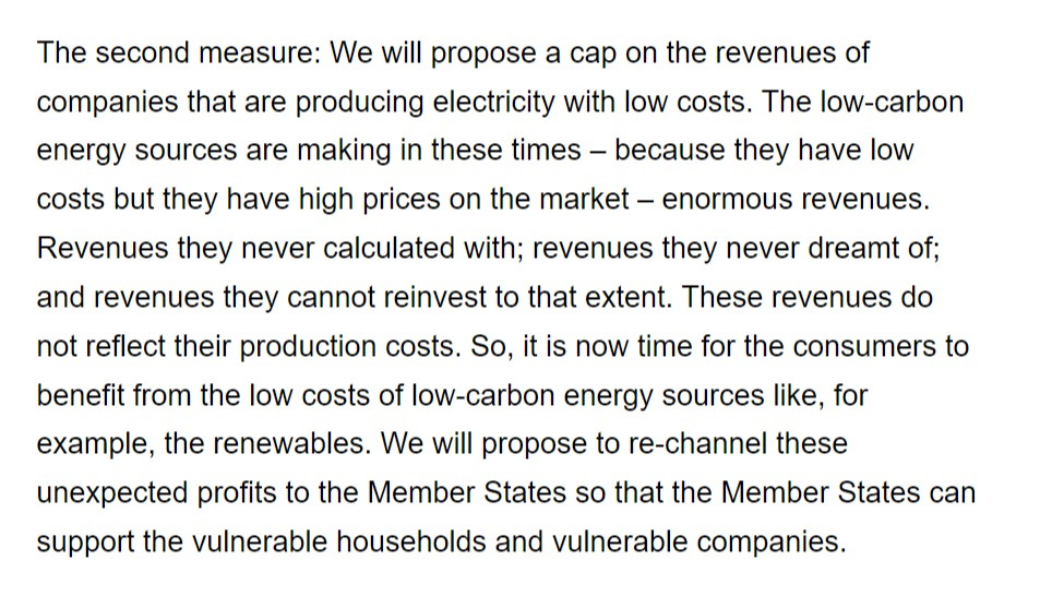 not only is she wrong about renewables in terms of costing, but she’s literally taking any advantage they do have from the currently outlandish prices of european nat gas (roughly 12X what they were in 2019 at ~200EUR/MWH) and making it non-economic. if you really wanted to “green the grid” then allowing huge profits is how you do it as it would attract huge investment. “the cure for high prices is high prices.” instead, they impede it.