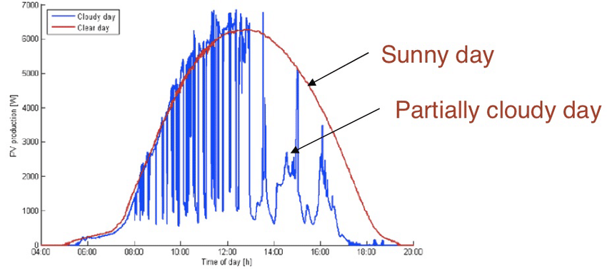 solar is simply terrible in this regard. not only is it a product that is not applicable to most regions, especially in winter, but it is also only available a few hours a day. even in excellent conditions, you’re only above 1/2 peak power for about 6 hours a day and are basically running at 0 for 12 hours. add in “partly cloudy” and you can see not only how rapidly you lose 80-90% of output, but how jarringly variable that output becomes. you’re talking about 5X leaps and 85% drops within the hour.