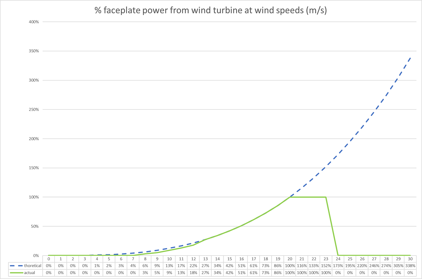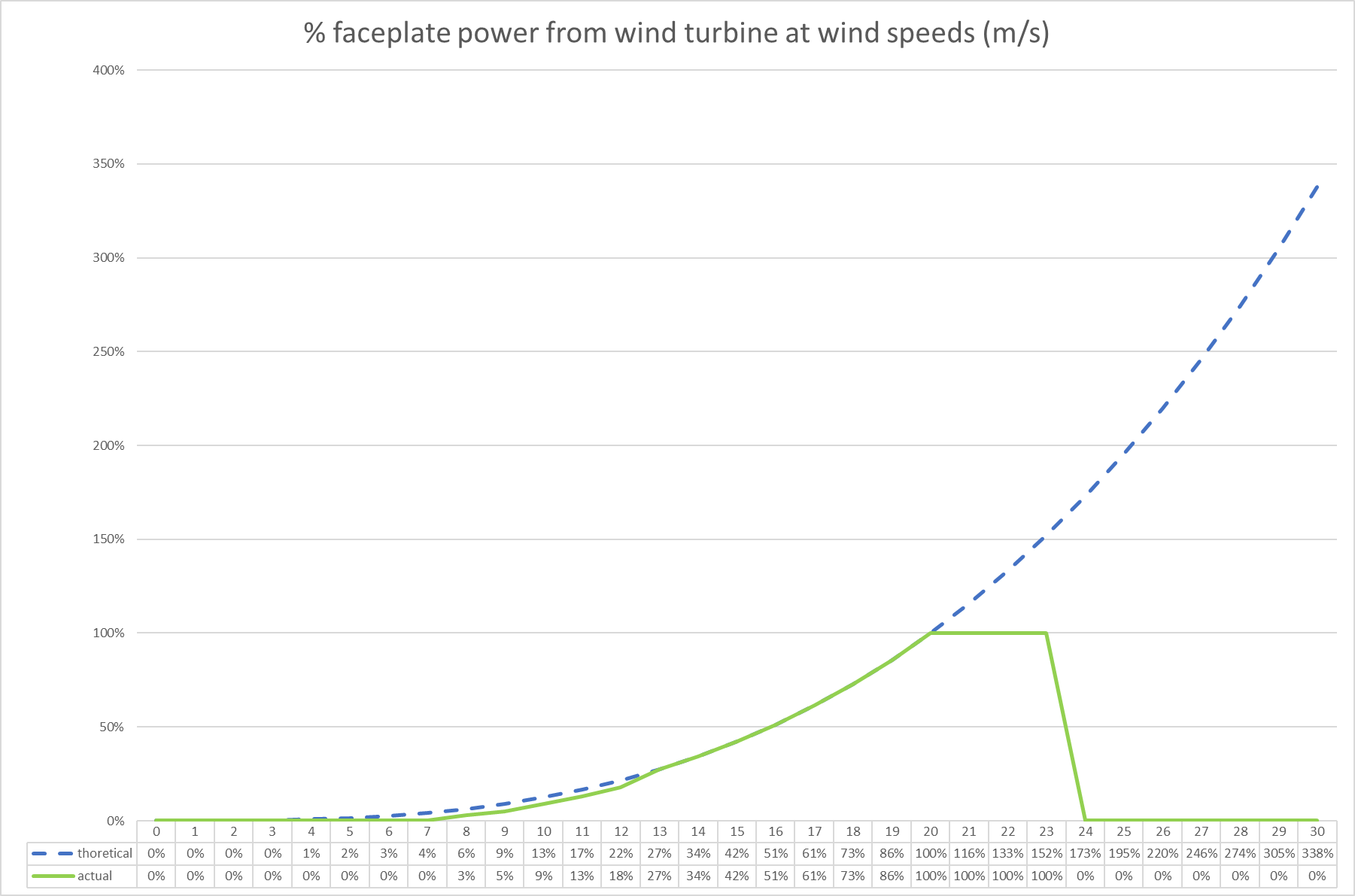 but the real curve is somewhat different as below minimum speed, the turbine cannot RPM match and will not cut in. it then takes some time to catch up to peak output frontier. also, when you exceed peak output, you can feather blades to dump wind (or brake on smaller systems) for a bit but then you need to cut out to save the turbine. i have assumed that point at 150% of nameplate and shown it on the green curve which is the output you actually get.