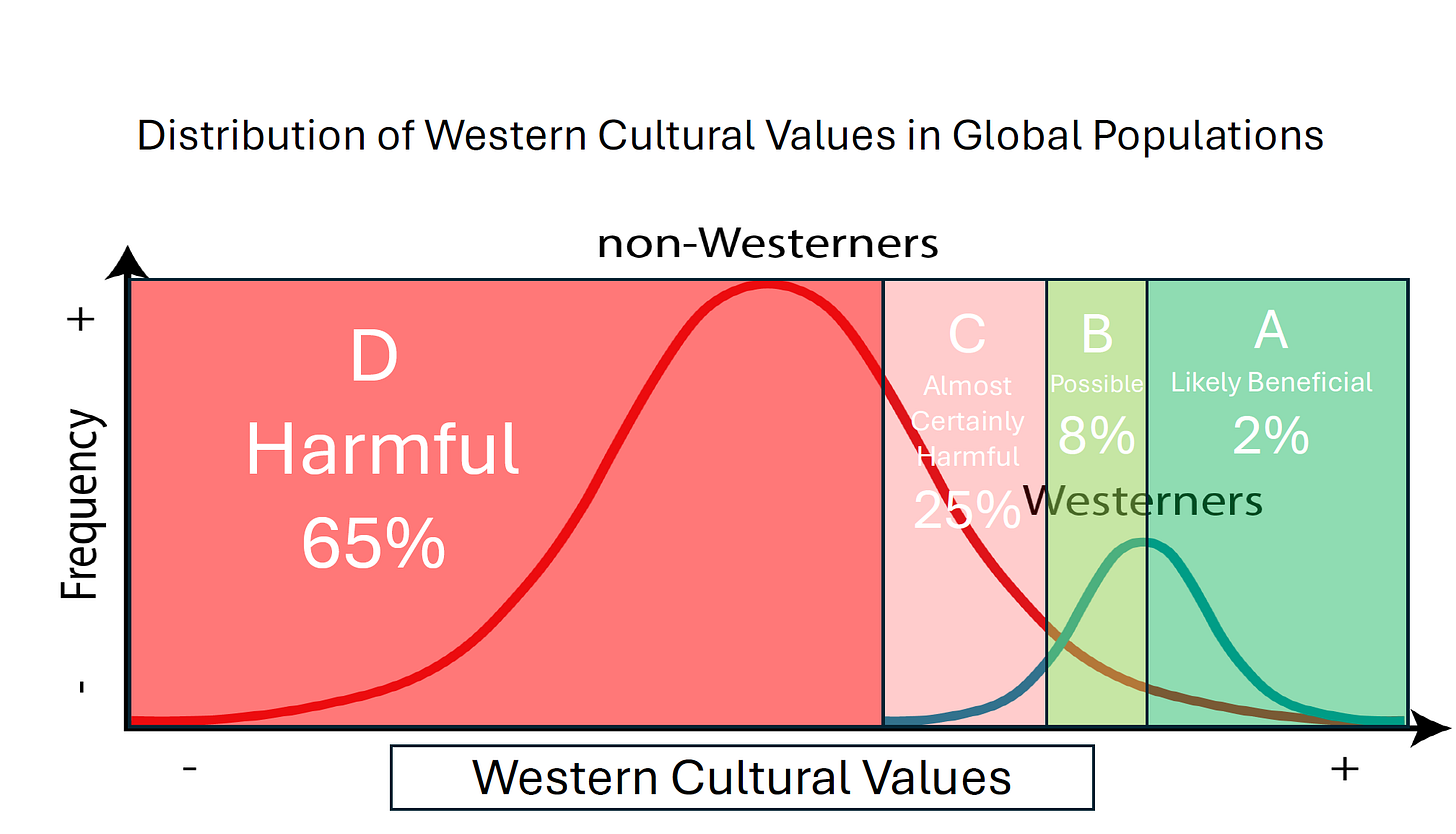 C: this part of the non-western curve overlaps the bottom 10% of western society, a group that is, itself, generally the source of most problems in the west. we have plenty of that already, thanks. thus, “almost certainly harmful.”