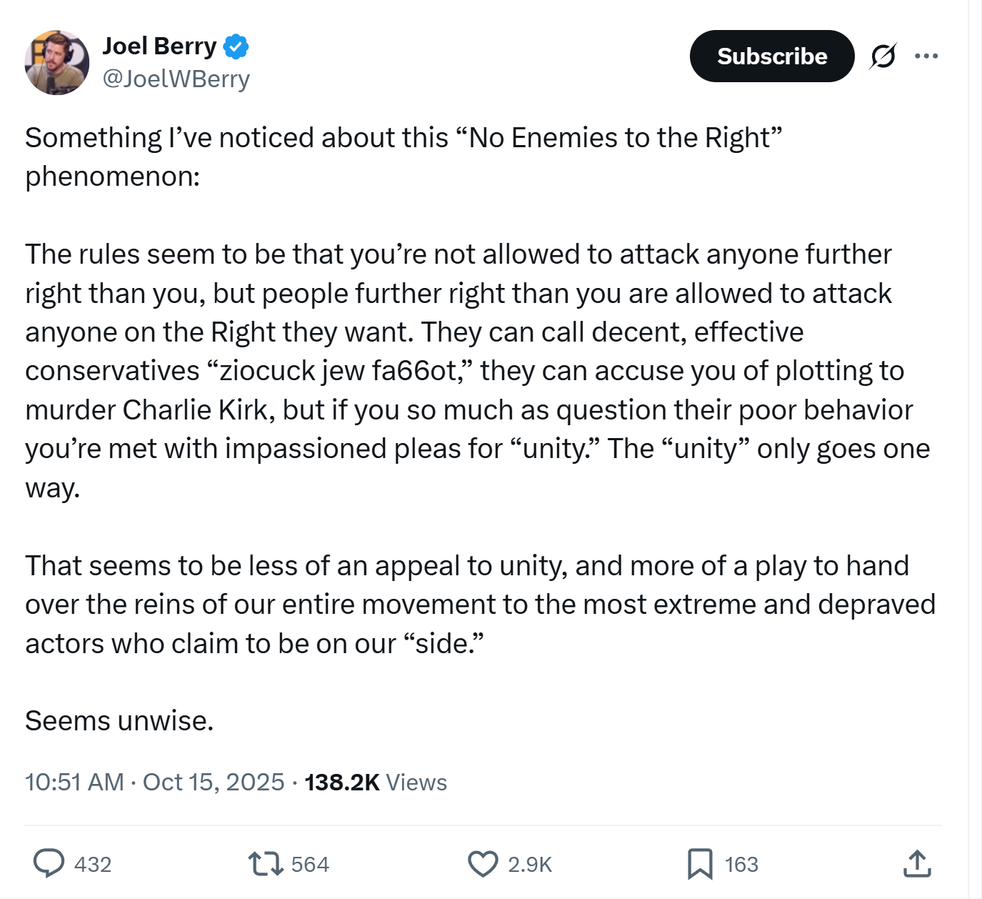 this did not stop it from spreading widely and causing all manner of mess. you expect this of much of the leftosphere, whose stock in trade has long been making up the views of those they compete with and using them to hobgoblin their faithful into terror driven anger, but the surrendercon right also really jumped into the fray in disappointing fashion.