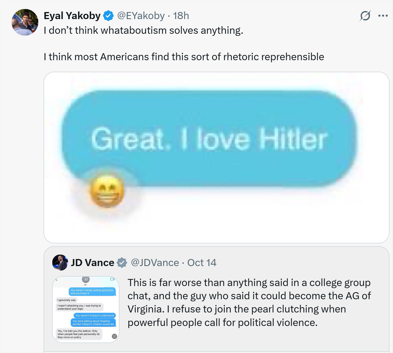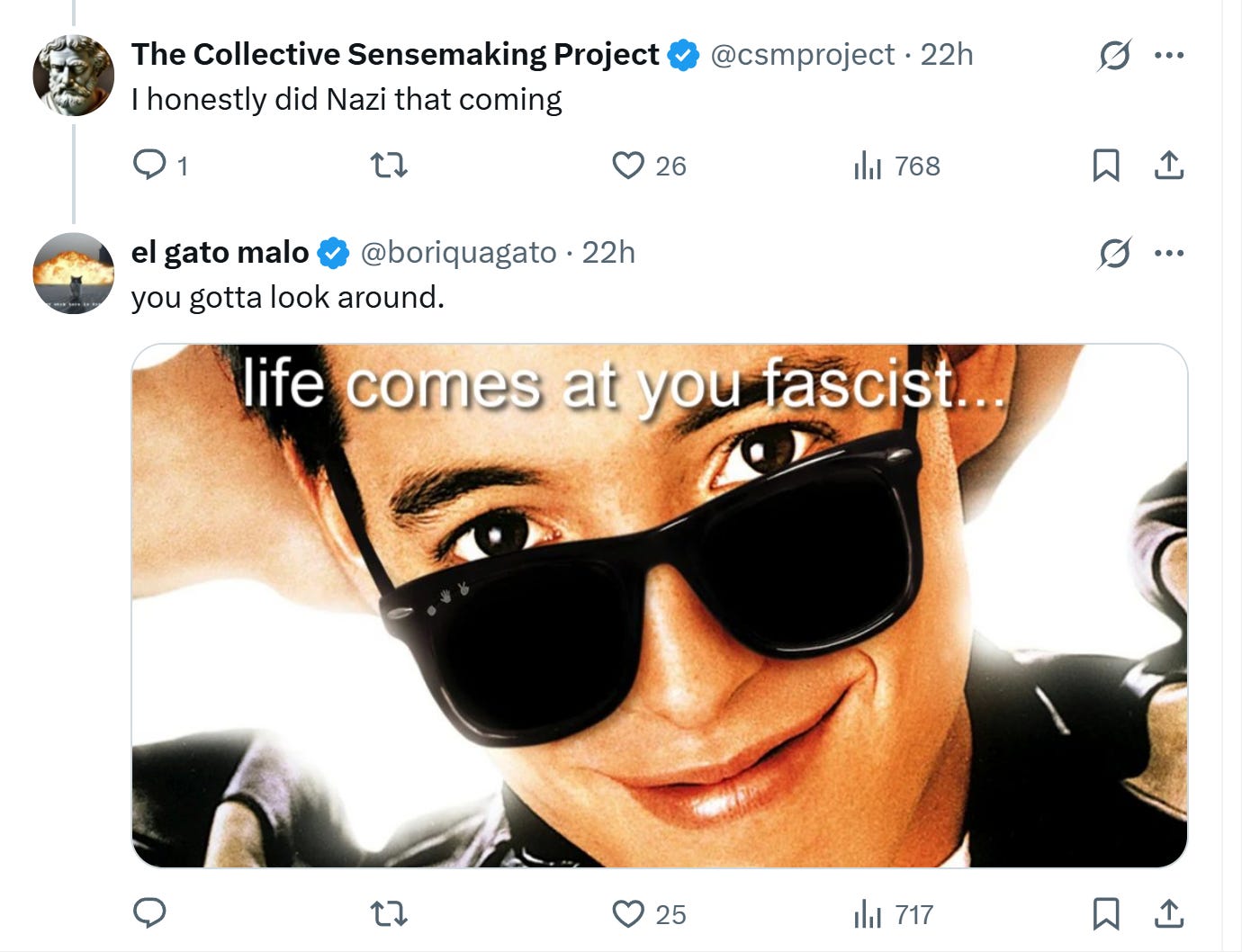 note that they chose (in pure godwin fashion) “i love hitler” as their lead quote. this is obviously incendiary stuff. it set off an avalanche of “see, told you these guys were nazis all along” victory crowing from the crew whose primary argument for 15 years has been this: