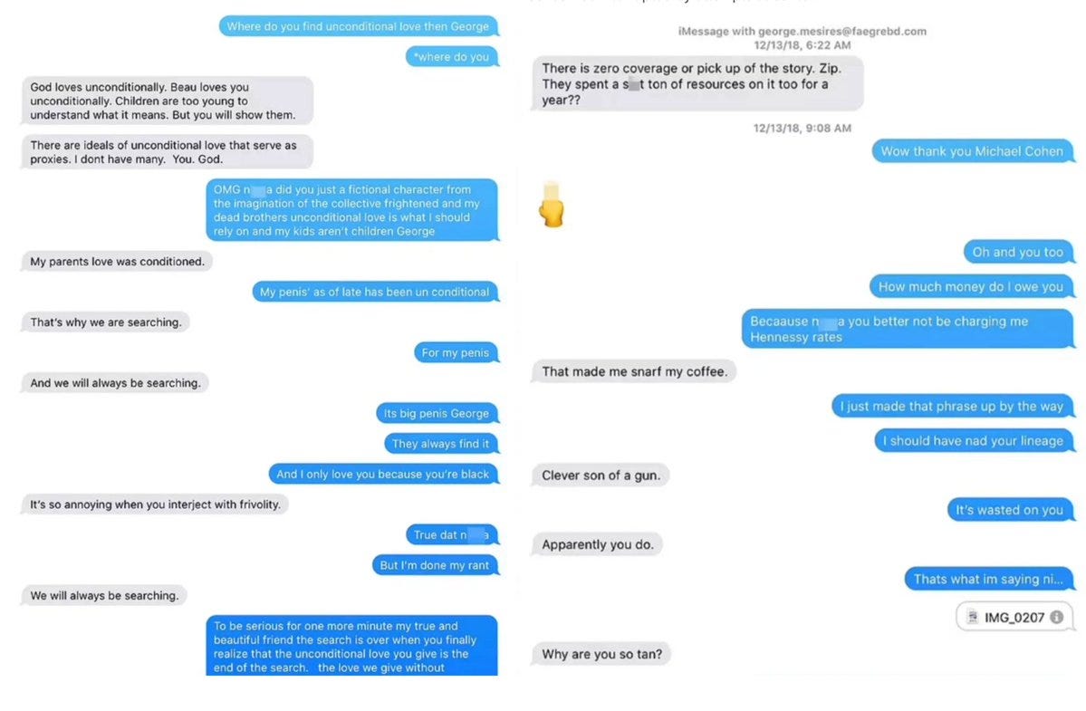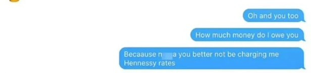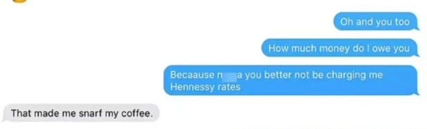 hunter (blue) “because nigga you better not be charging me hennesy rates” to george (gray) who is black. george responds “that made me snarf my coffee.”
