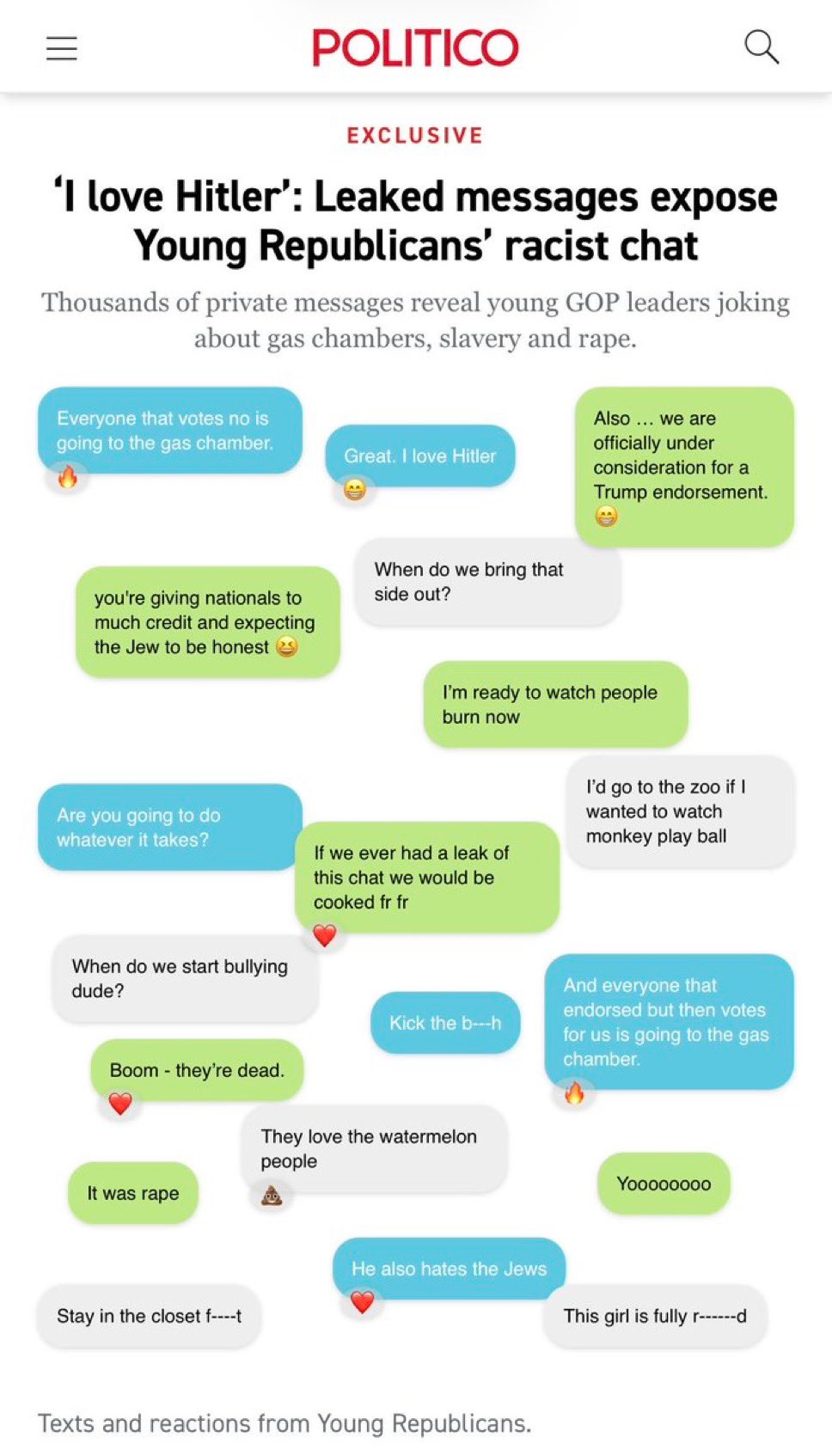 folks like politico lock in on whatever is most inflammatory and damaging to the right and then misrepresent it to cause anger. it’s WHY they do this. they know it’s a matter of degree and so they seek to make the offense look massive through misrepresentation. then a bunch of state GOP agencies run by young chumps fall for the propaganda calculated to entrap them.