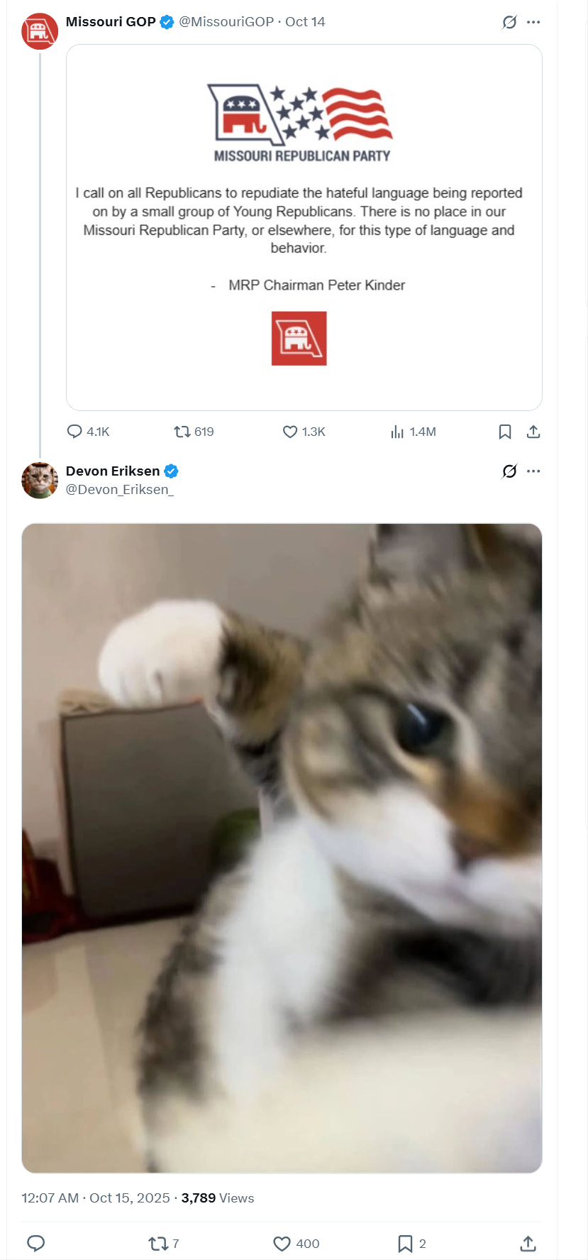ok, so i know i said i was not going to read any further into these texts because taking the provocation culture of alpha male bonding literally is an exercise in stupidity, but (there always seems to be a but, doesn’t there?) at a certain point, the sheer level of decontextualized dishonesty foisted by folks like politico to rage bait their base into the next round of talking points and to try to split the right by making them disavow falsely framed accusations just drives a kittycat to distraction.