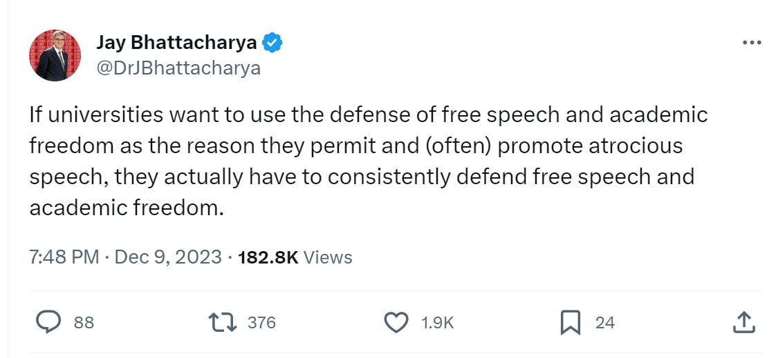 the spectacle of the same universities that have spent 3 years calling free speech “hate speech” around fairly neutral ideas like elections or epidemiology or medicine suddenly lining up to defend some truly hateful speech about terrorism through murder, rape, and dismemberment of peaceful people constituting “permissible protest” and characterizing the support of such ideologies as “academic inquiry” seems to be snapping something. it’s the exponential doubling too far that makes the disease obvious and elicits a societal immune response. academia as pathogen has snapped into focus and no longer appears a cute game for the parlor or the academy. this instant pivot to the very ideas of freedom these selfsame stentorians shrilly censored for 3 years has laid their ethical bankruptcy plain.