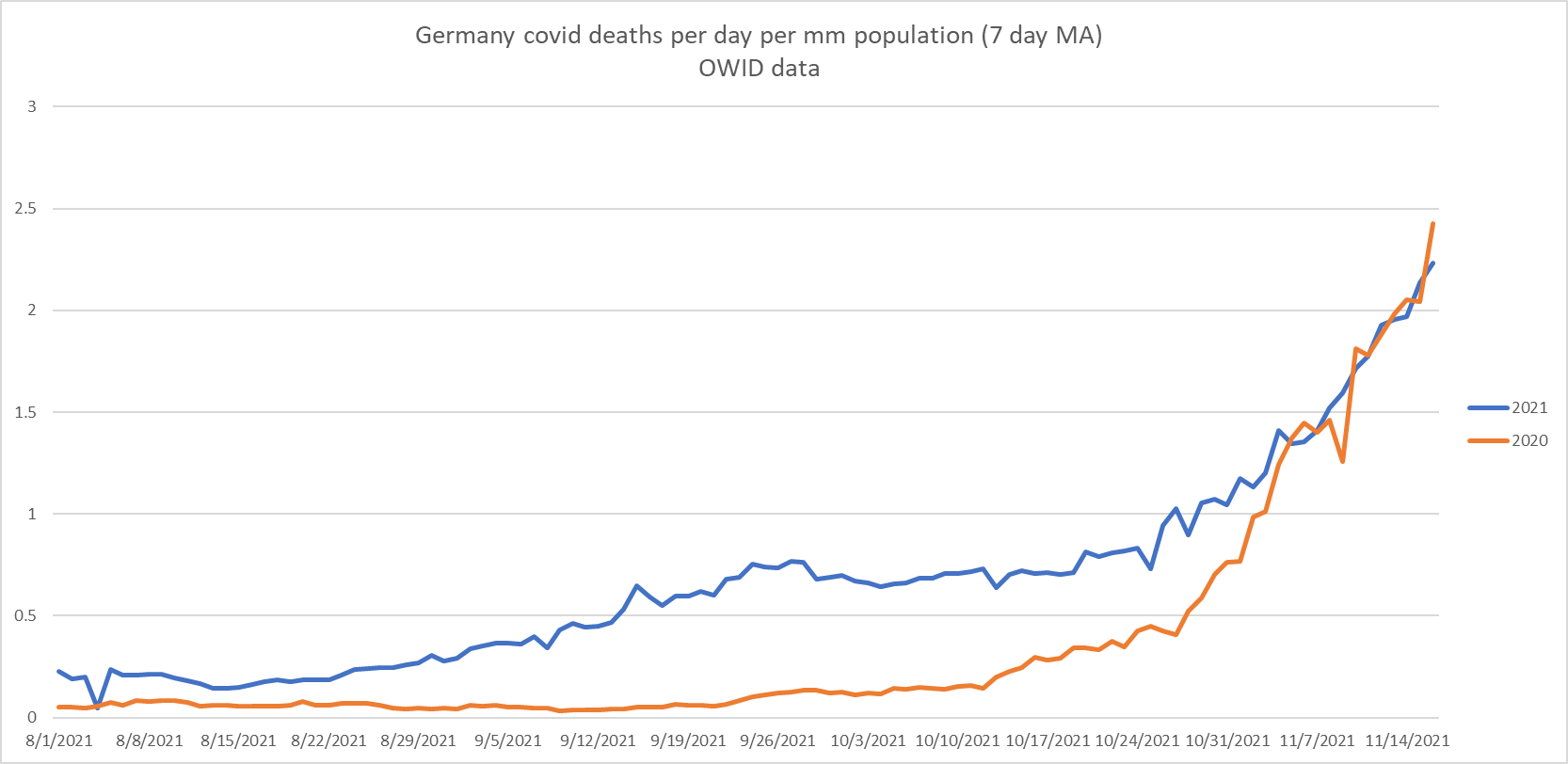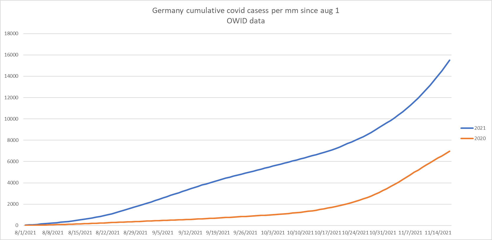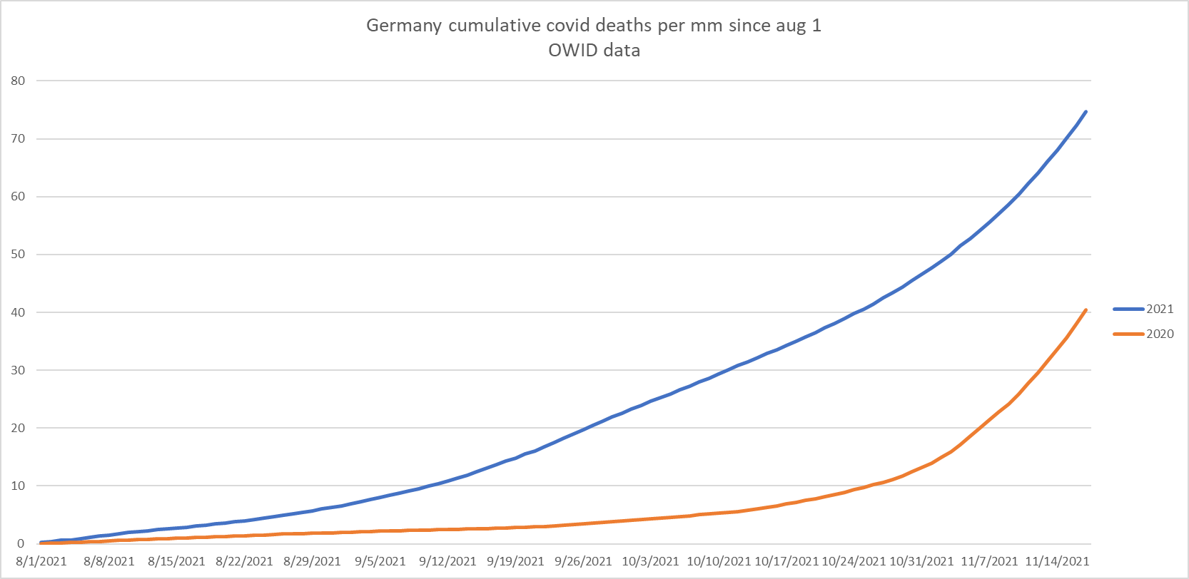 to make this easier to see, i grabbed the our world in data data and plotted it year against year starting august 1.