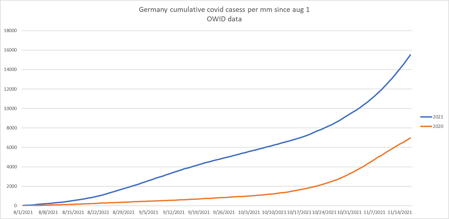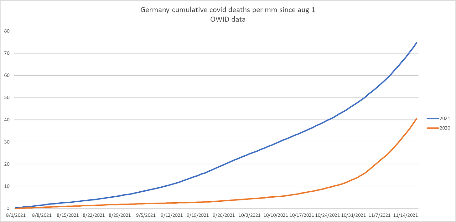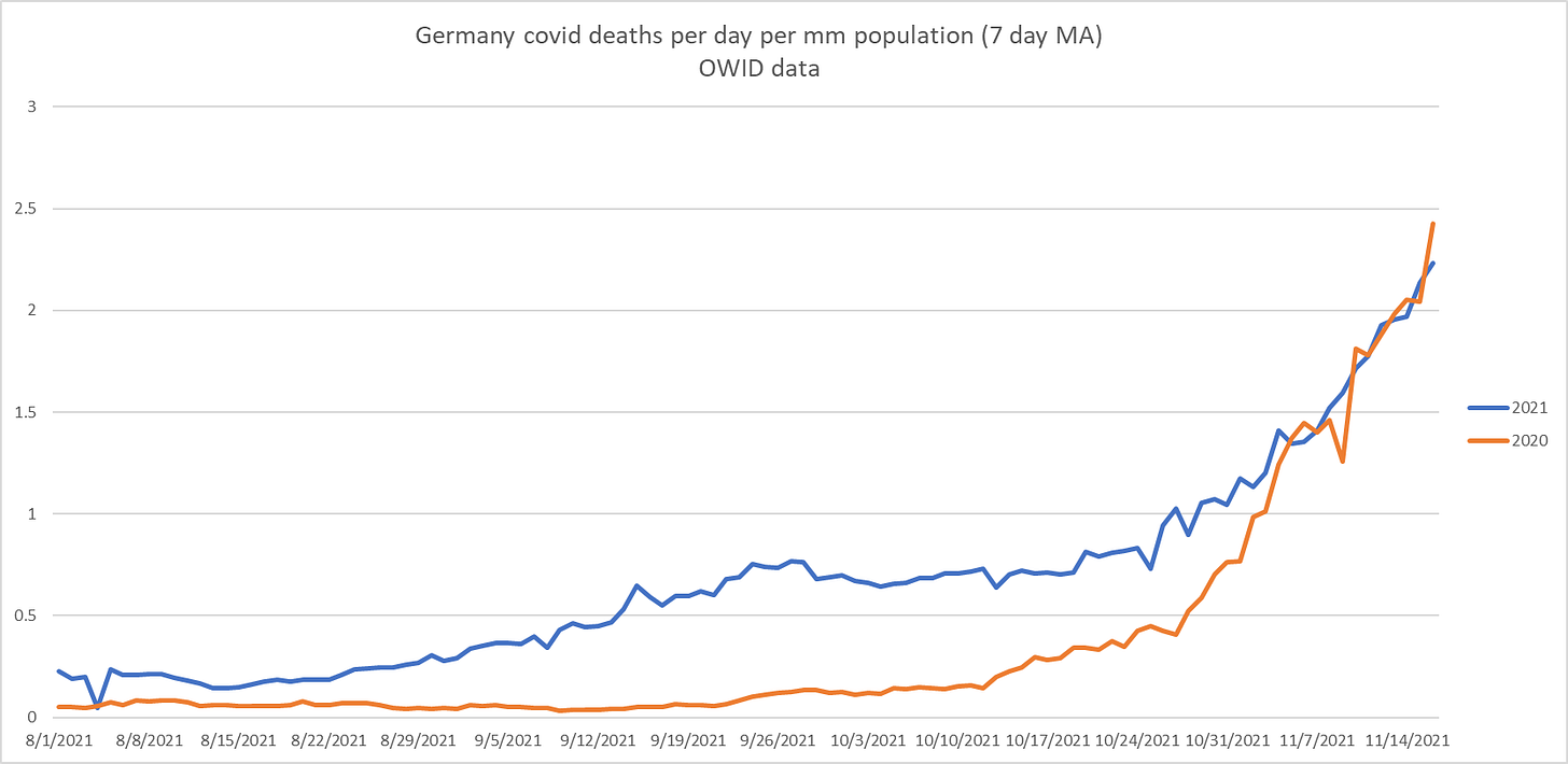 My country Ireland is perhaps the clearest example of this. We hit 50% vaccinated in July and are at 95% of adults now and 90% over 12. Every single metric is MUCH worse than this time last year, including deaths which have been higher every month since and including July. I have all this in a spreadsheet if you want it.