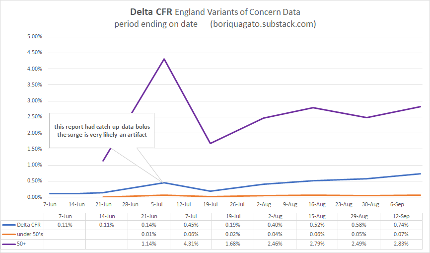 we’re into the realm of error bars too big to do any useful math on that, but it seems plausible to me that we’re seeing a situation like the UK where despite some VE on death, it’s being swamped by the vaccinated being at higher risk for cases and by a leaky vaccine increasing CFR on delta variant so even the vaccinated have become more likely overall to die of covid.