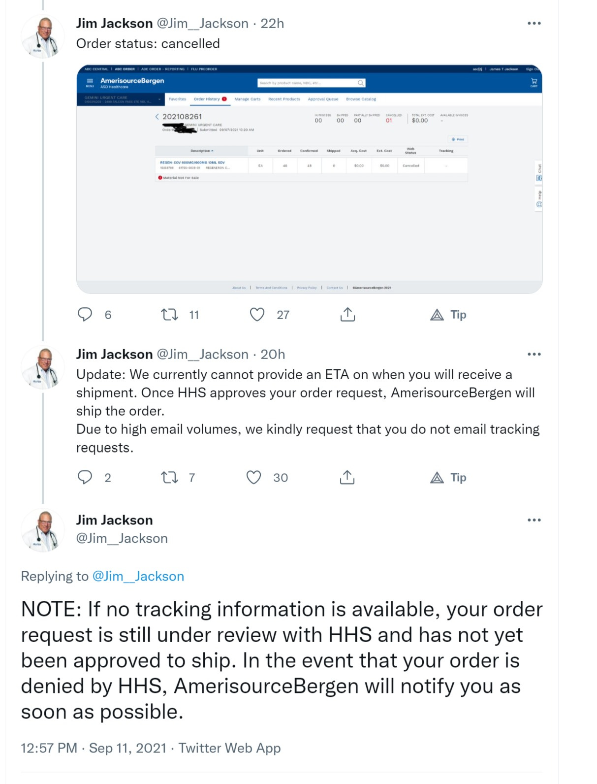 “Still no antibodies today. It seems that they won't be sending more. I've referred several patients elsewhere but it's very frustrating not being able to offer the most effective COVID treatment to them. I reached out to the distributor but haven't gotten a response.”