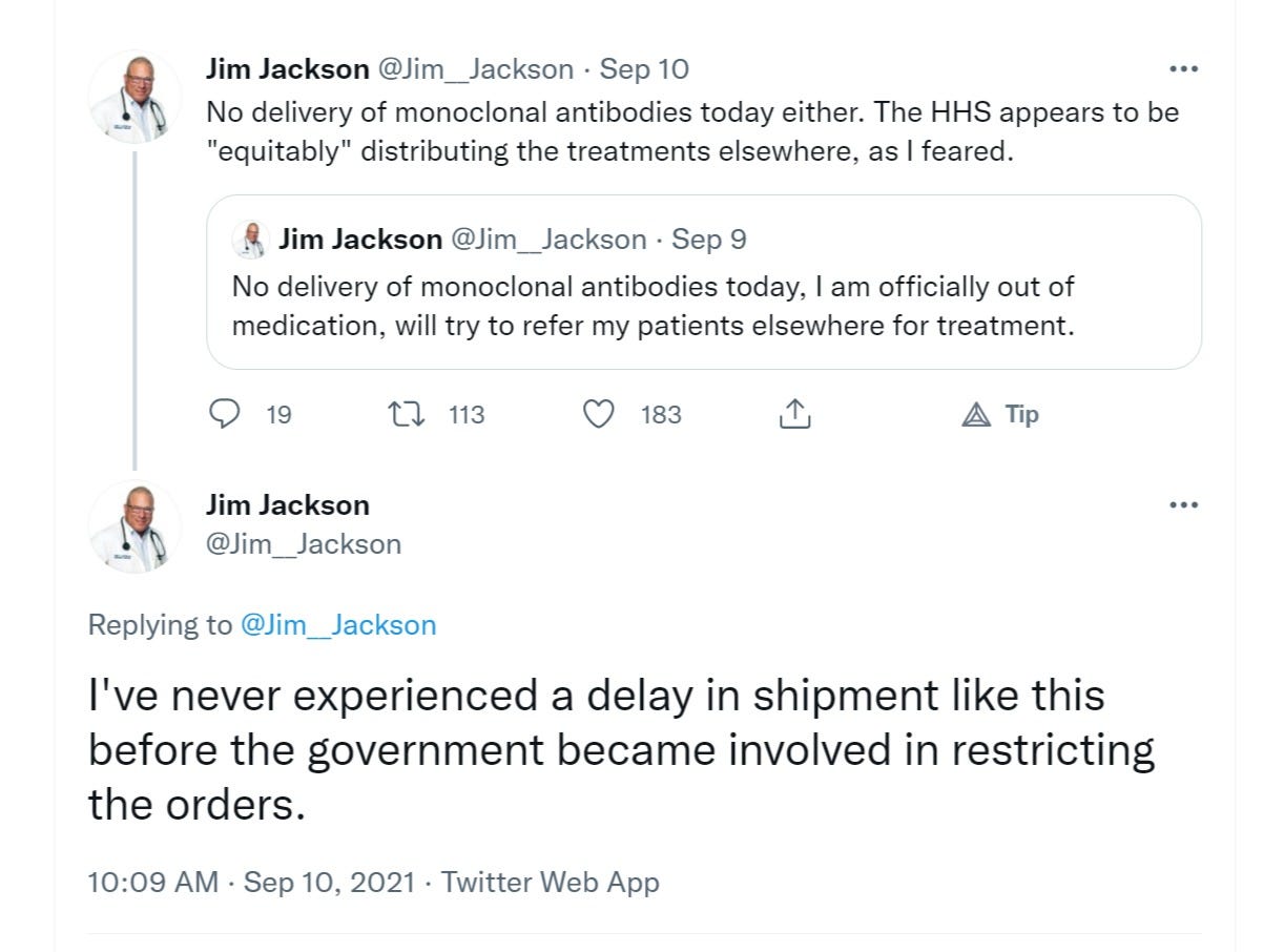 and, inevitably, you get a total fail because there is nothing government is better at providing or distributing than the private sector is. if you need to get bottled water to a hurricane zone, who would you trust? FEMA or walmart? it’s not even close. and this is why the government assuming control of distribution of antibody infusions is going to be so dangerous: the best you can expect is incompetence and inability to read or respond to market signals.