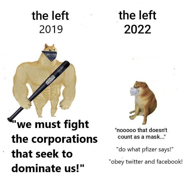 the left have been caused to experience a full “snaparound” from one end of the horseshoe to the other. the same guy who was saying “boycott starbucks and their corporate zombie empire and stop animal testing” is now telling you that you must trust corporate media, social media, and do whatever big pharma says or we should summon the national guard to lock you in your home.