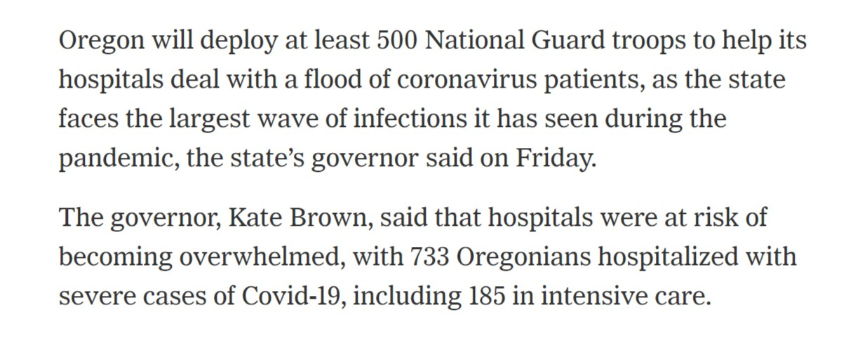 let’s look at new media sensation oregon as well. the governor there is looking to deploy national guard to “help overwhelmed hospitals” according to the always histrionic and rarely fact checked pravda on the hudson who seem to have so gleefully taken on the head cheerleader role for the covid apocalypse.
