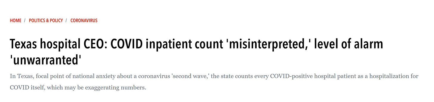 one of the key stratagems of peddling covidian panic has been the selective amplification of hysterical anecdoatalism and outright misstatements about “hospitals being overwhelmed.” this was true literally almost nowhere last year, even in perennial basket case new york city. the javits center went unused as did the hospital ship they so breathlessly demanded. media shrilled about “sharing ventilators” then it turned out they were doing it to “see if it worked” and never out of need.