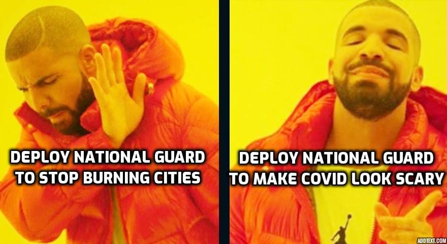 i mean, this must be a pretty dire crisis, because this is the same governor who told the national guard to pound sand and that it was not needed when major cities were literally on fire and being overrun by armed antifa declaring sovereign zones and besieging mayors and government buildings.