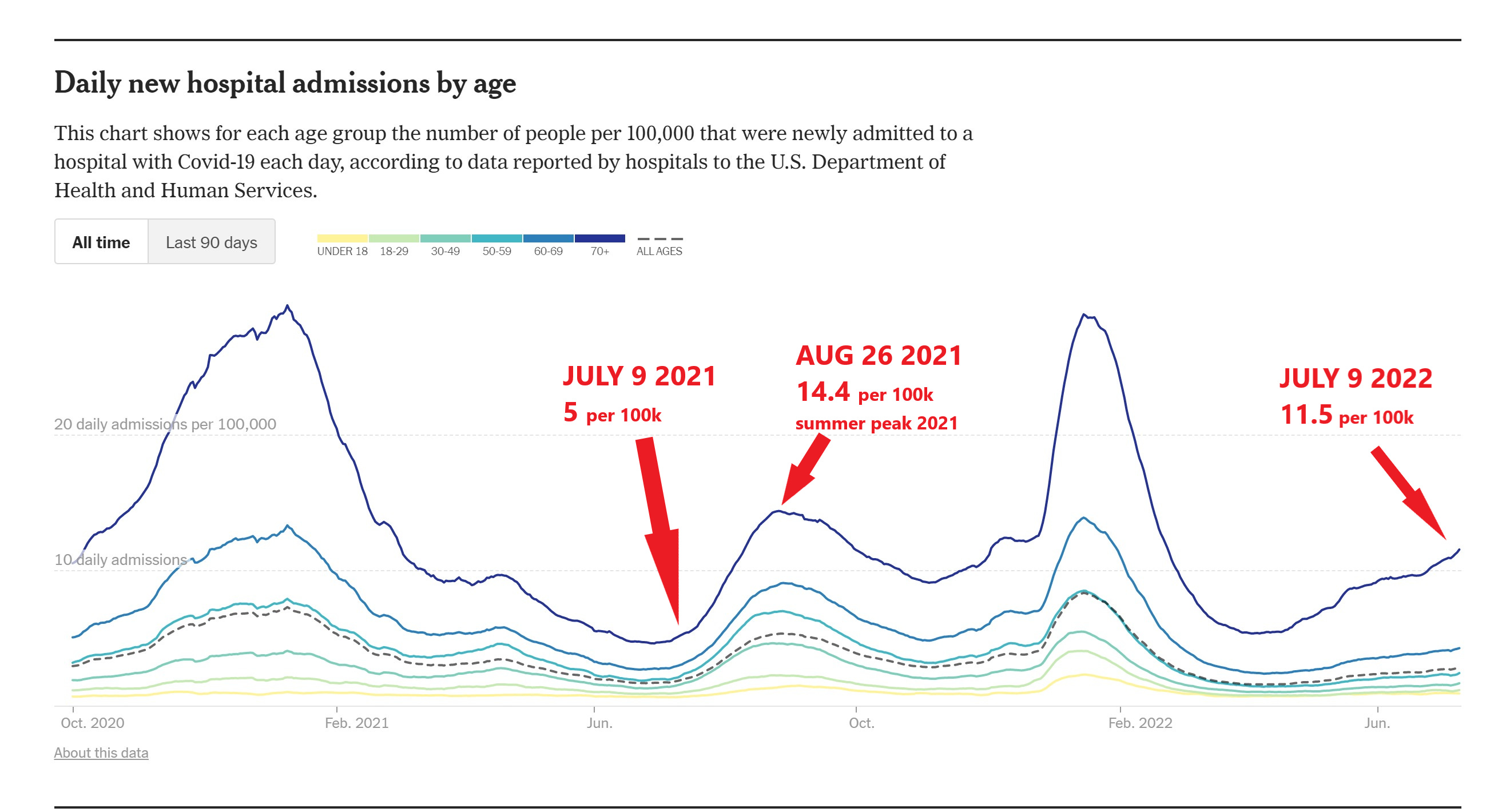 US over 70’s are near 100% vaxxed and highly boosted. yet their hospital rate is more than double (+130%) year on year despite an objectively milder variant. we’re already approaching the summer highs from last year despite being 6-7 weeks away from a likely peak. my money is on “we exceed it significantly.”