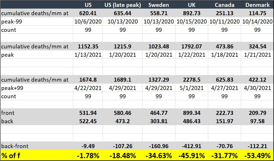 there as well, even when given every benefit of the doubt, we can see that the US curve bent the wrong way. other countries with similar seasonal expression saw the back half (post peak) of their deaths curve show ~40% fewer deaths. (avg -41%, median -40%) while the US was near symmetrical dropping less than 2% (or 18% if we align peaks to be sure we are not cherry picking)