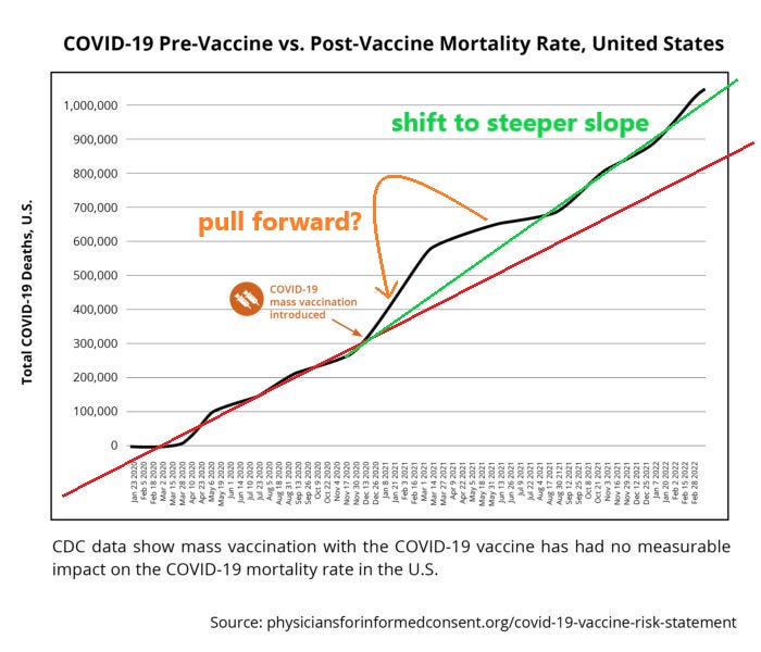 covid deaths had been tracking at a quite linear trajectory. then, right around the commencement of mass vaccination in the US, they accelerated (despite a less deadly variant, more acquired resistance in the population, and the prior cull of high risk groups.)