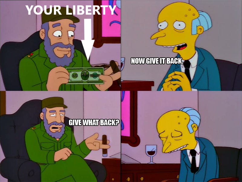 you just want the power usurped and the systems in place so you can use it later for other purposes, generally against your own people, because, by then, it’s too late.
