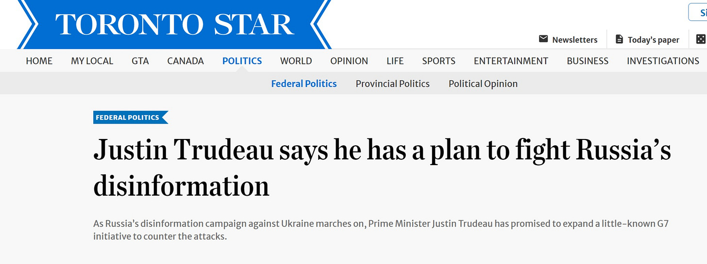 Trudeau’s answer to combating Russia’s information is to renew an initiative known as the G7 Rapid Response Mechanism (RRM). He committed to spending $13.4 million over five years to expand the RRM. That’s on stop of a separate $3-million-pledge through a different program that will help Ukrainians build “resilience” to disinformation, Global Affairs Canada told the Star.