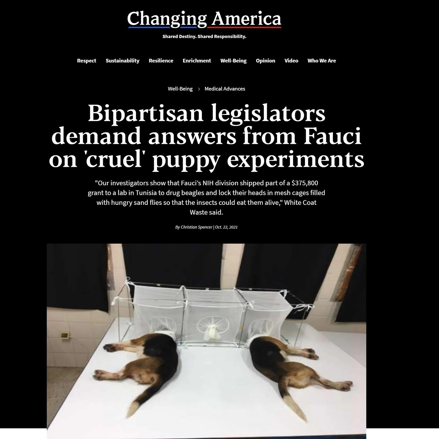 "Our investigators show that Fauci’s NIH division shipped part of a $375,800 grant to a lab in Tunisia to drug beagles and lock their heads in mesh cages filled with hungry sand flies so that the insects could eat them alive," White Coat Waste told Changing America. "They also locked beagles alone in cages in the desert overnight for nine consecutive nights to use them as bait to attract infectious sand flies."
