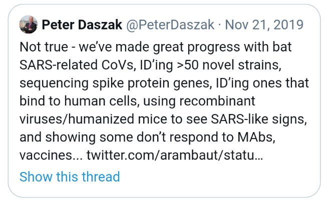 peter and his merry band of bat virus hotwirers are still out there and have a new home (and budget) at columbia university in NYC, a university group that not only won awards from the CCP for work at the wuhan institute of virology, but also looked involved in the GoF cover up.