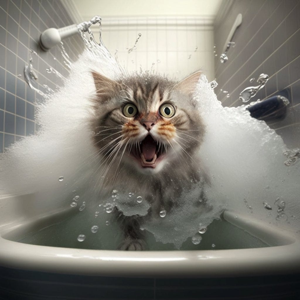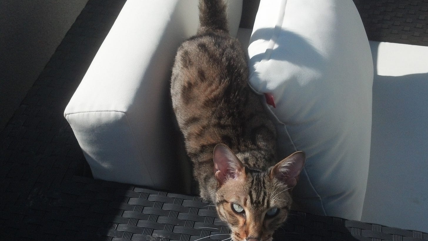 the original el gato malo (who alas is no longer with us) was a savannah cat of profound focus and astonishing cunning. there was nothing he loved more than ham. one day i was eating a ham sandwich in my home office. he arrived and started seeking to eat it. i told him no. so he walked over and knocked over my water bottle so it was pouring into my printer. when i jumped up to grab the bottle, he grabbed the sandwich and made his getaway.