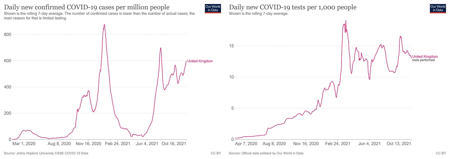 cases are actually down in the UK from this time last year. testing is up 3.6X while cases are only up 2.5X. that implies that on a testing adjusted basis, cases are actually down about 30% YoY.