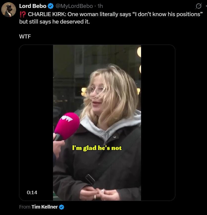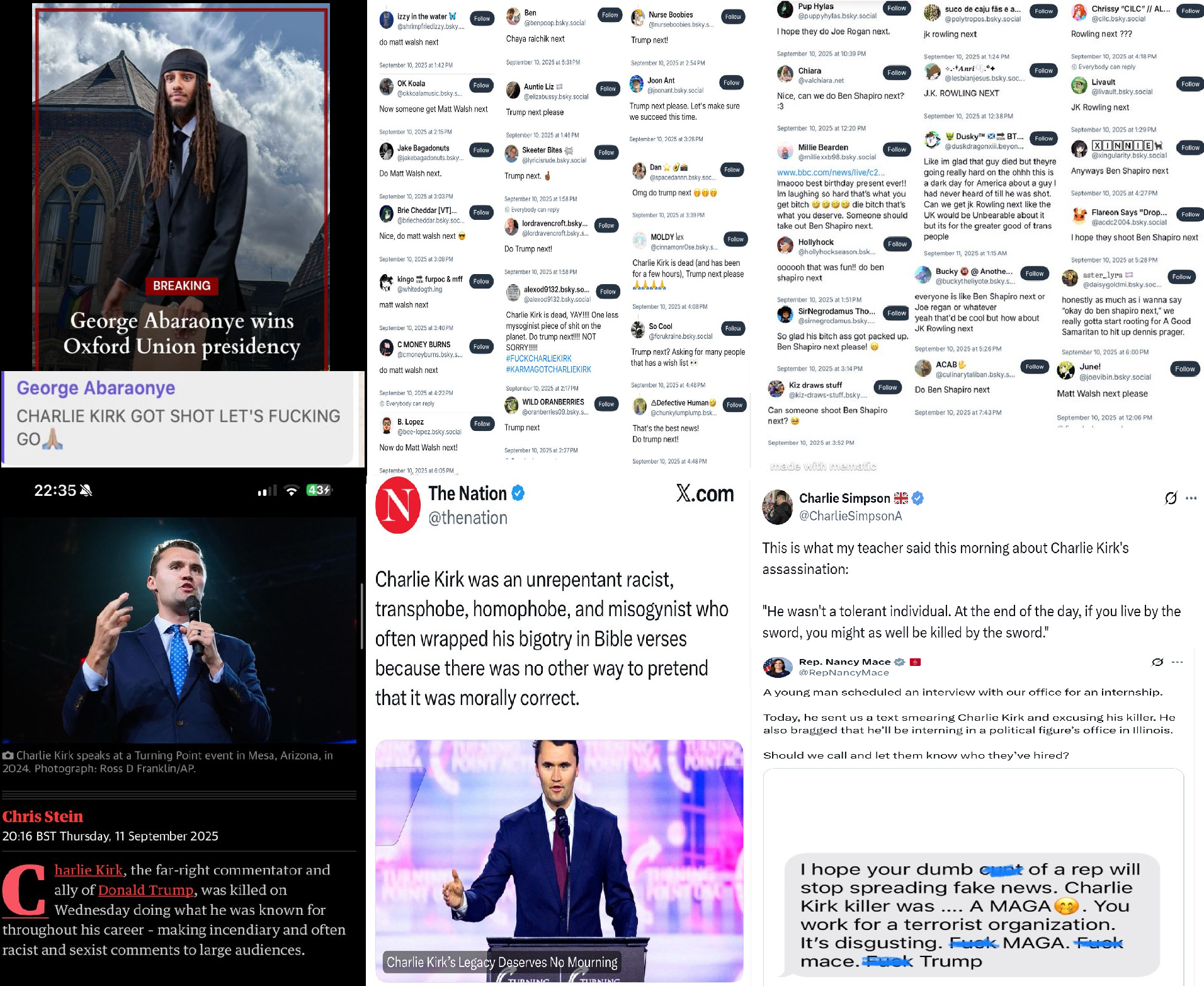 Basically nobody cares what Very Online Randoms are saying about Charlie Kirk, but they're reacting in horror to what the people they know IN REAL LIFE are saying about Charlie Kirk. That changes the perspective immensely. Instead of "those people over there wish bad things upon Charlie (and by extension me)," it's more like "the people I know in this room wish bad things upon Charlie (and by extension me)."