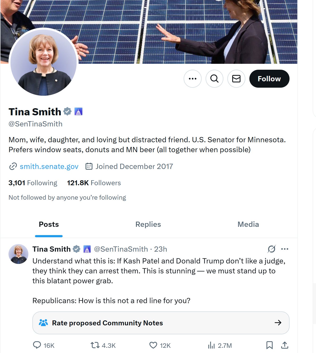 meet tina smith, senator from blue bastion homeworld minnesota, land of tim walz and 10,000 lakes of liberal tears.
