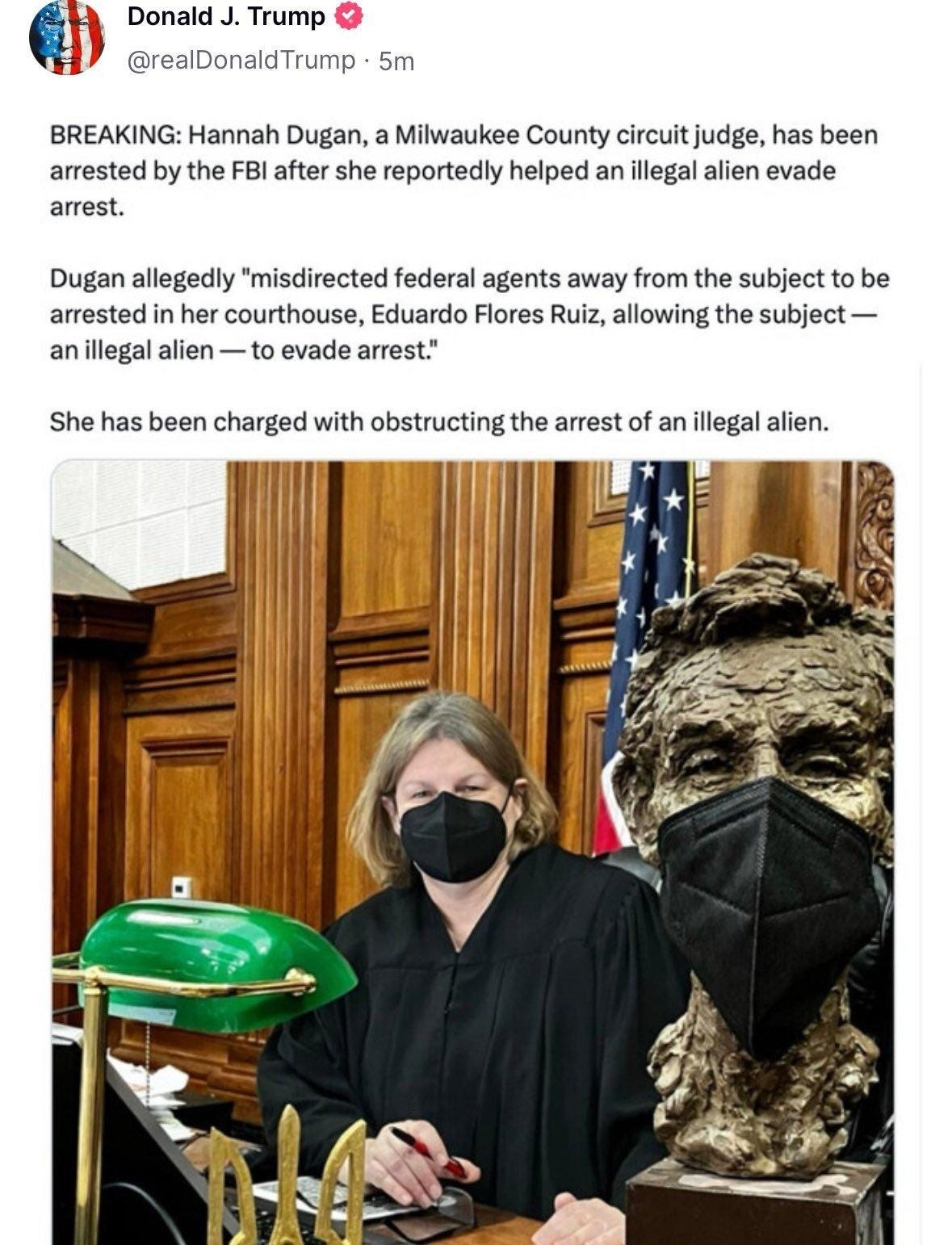 she is upset about what happened to judge hannah dugan, who seems like a straight from central casting made in karen factory number 147 character.
