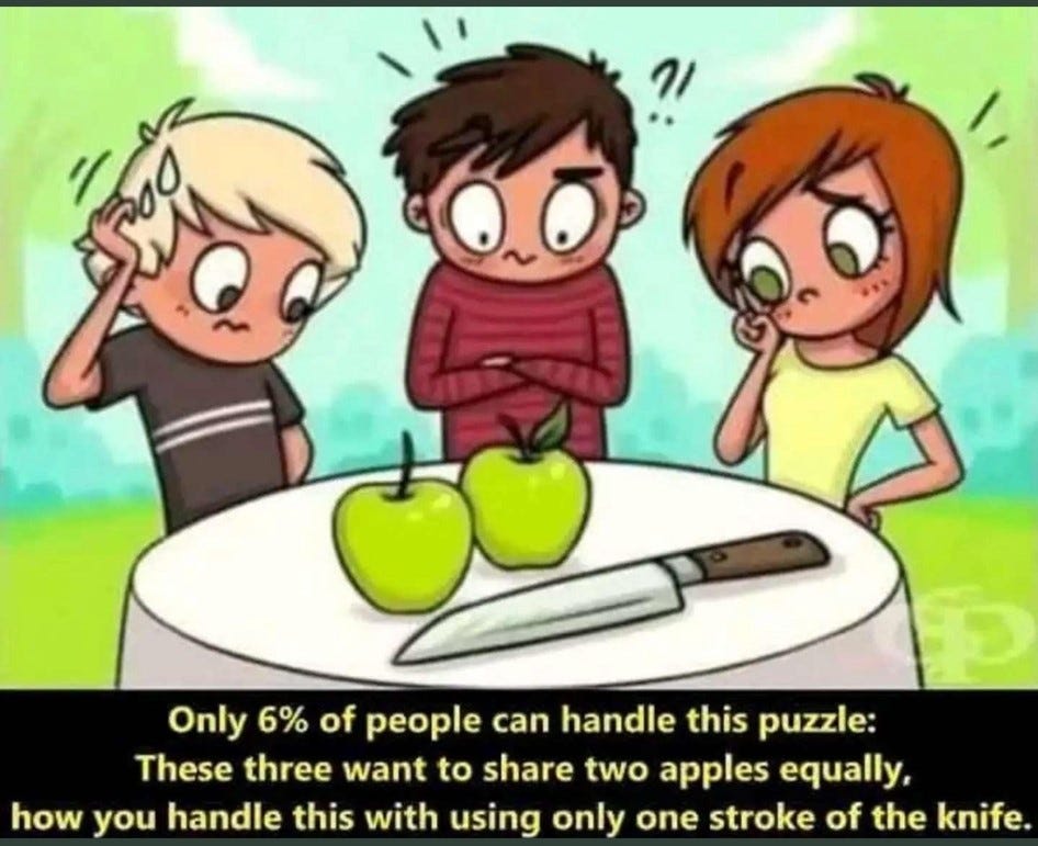 I thought of the second one right away LOL. Stab one of the people, the surviving 2 get 1 apple each.