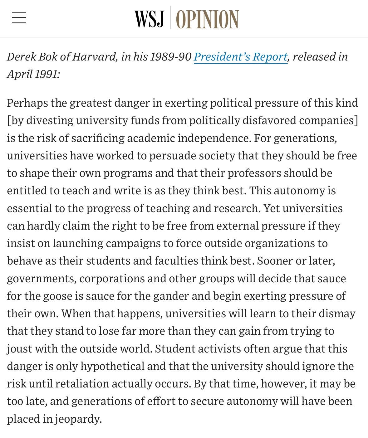 consider this missive from derek bok, lawyer, former dean of harvard law, and president of harvard from 1971-91. (and, ironically, again as a brief temp when summers was pulled down by anti-science cancel culture mobs). one cannot help but contrast this to the overt and conscious politics of later leadership (such as serial fraudster and plagarist claudine gay)