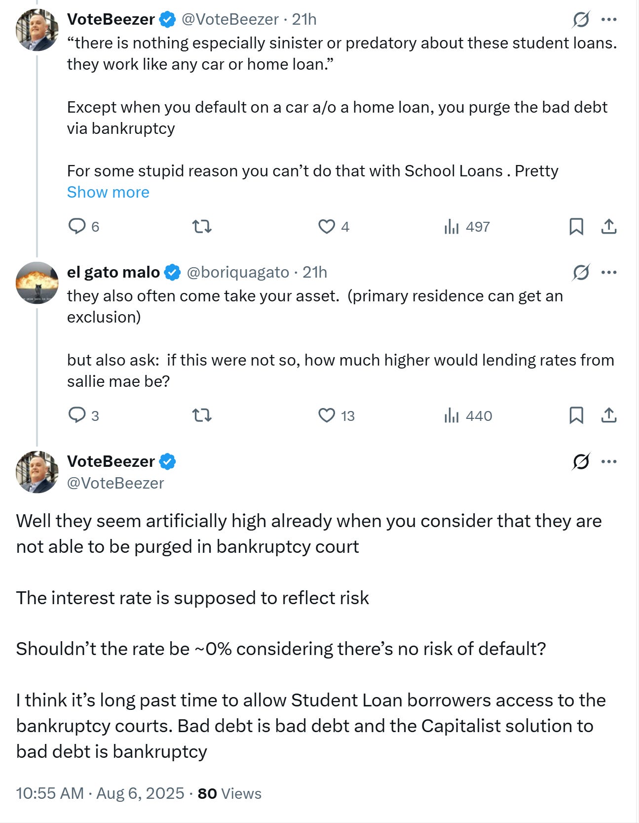 but the bigger (and more popular) issue to take with student debt is that “it cannot be cleared in bankruptcy” or perhaps “it’s overpriced.”