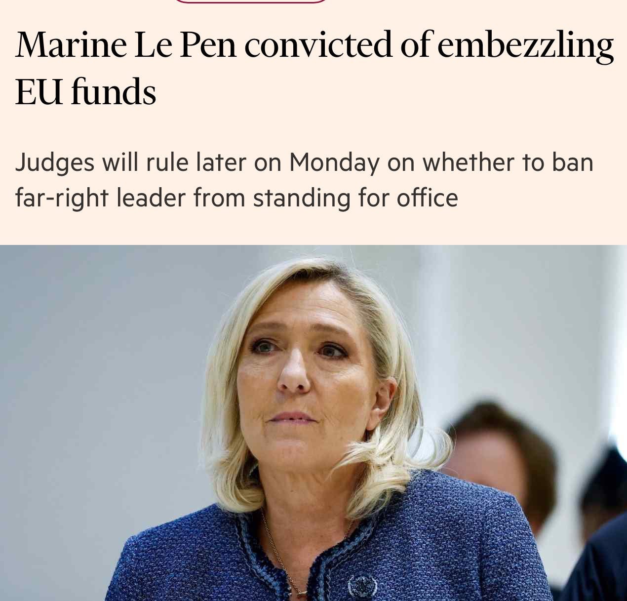 le pen was "convicted" of using money allocated by the euro parliament to pay for parliamentary assistants. there is nothing improper about that. this is, in fact, what the funds were for. at issue is whether those PA's worked sufficiently on EU-related legislative work as opposed to domestic work. this issue dates from 2004-2016, over a decade old, so hardly new news. the timing itself speaks volumes.