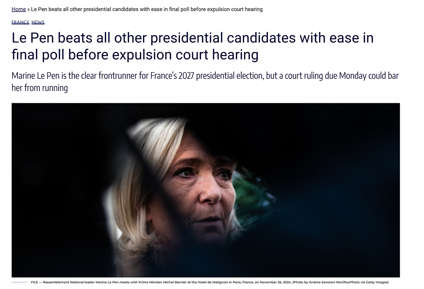 “If found ineligible, Le Pen’s absence from the ballot would be seismic, not only for her party but for the French electorate, who consistently place her ahead of any rival. The Ifop poll shows Le Pen capturing between 34 percent and 37 percent of first-round voting intentions, beating all likely centrist and left-wing candidates.” (source)