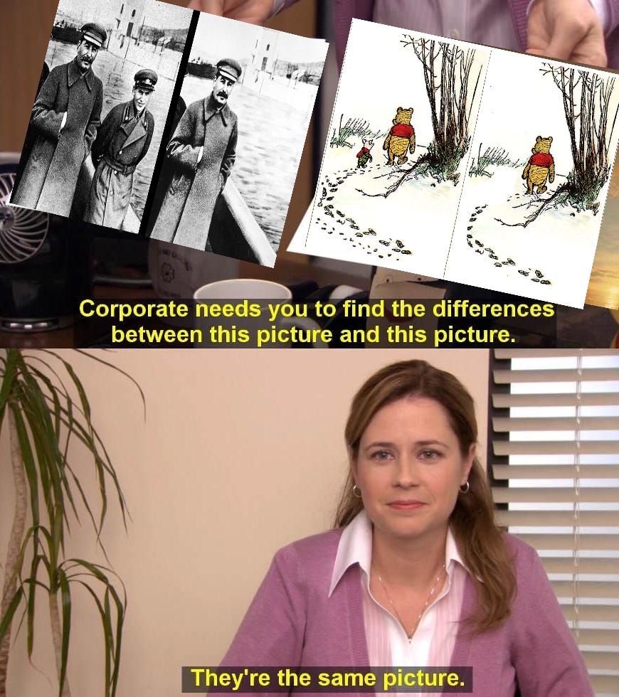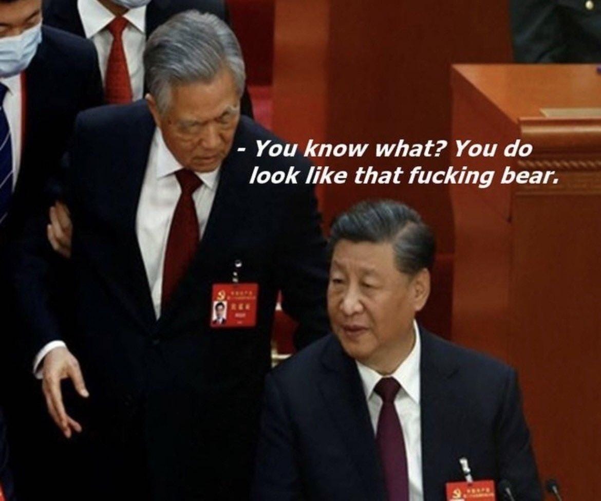 (for those who do not know, xi is often described as looking like winnie the pooh and is touchy about it to the point that such images are banned in china.)