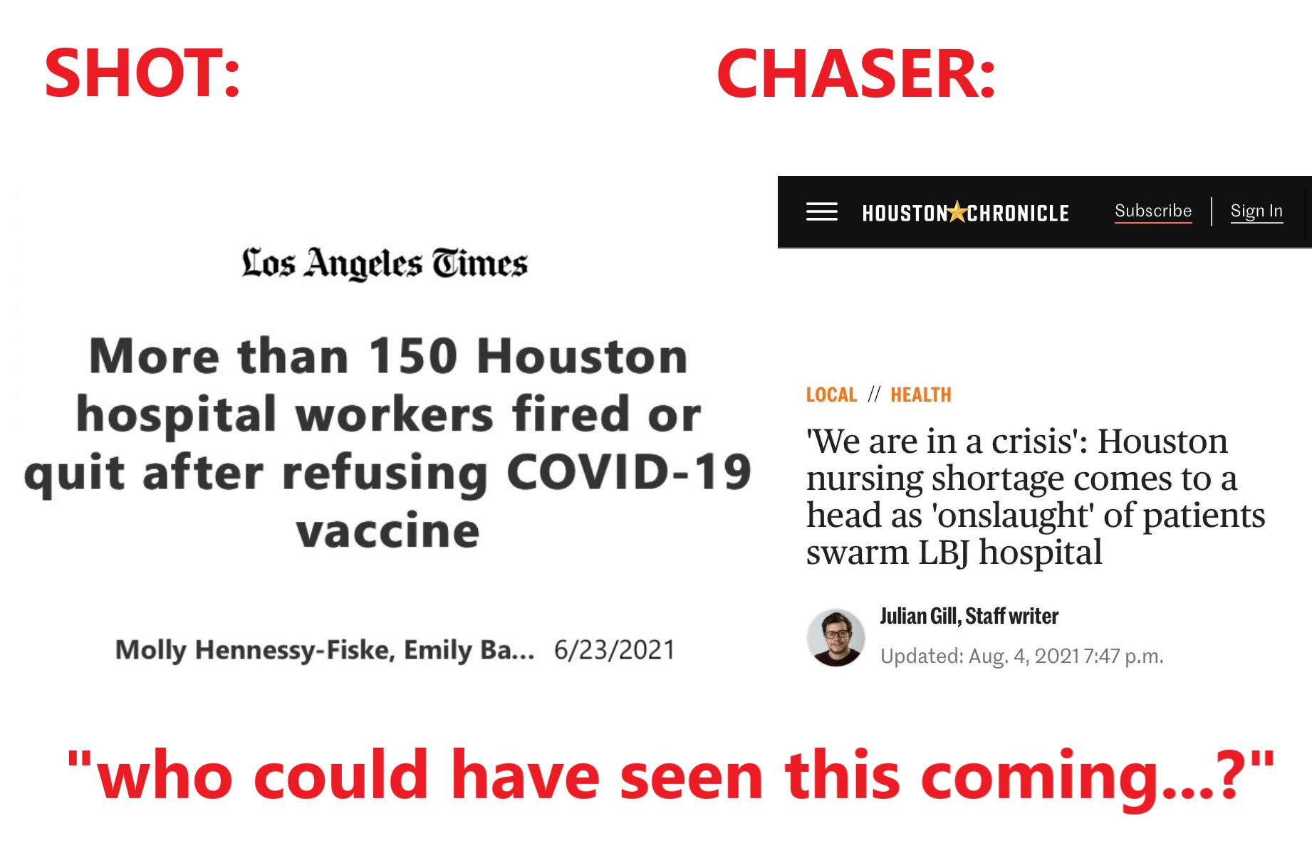 if you fire them for not taking the covid vaccine, you do not get to whine about "overwhelmed hospitals." the carnage will be on you.
