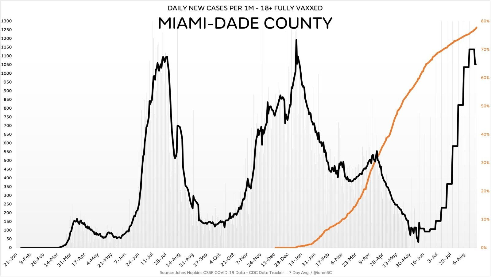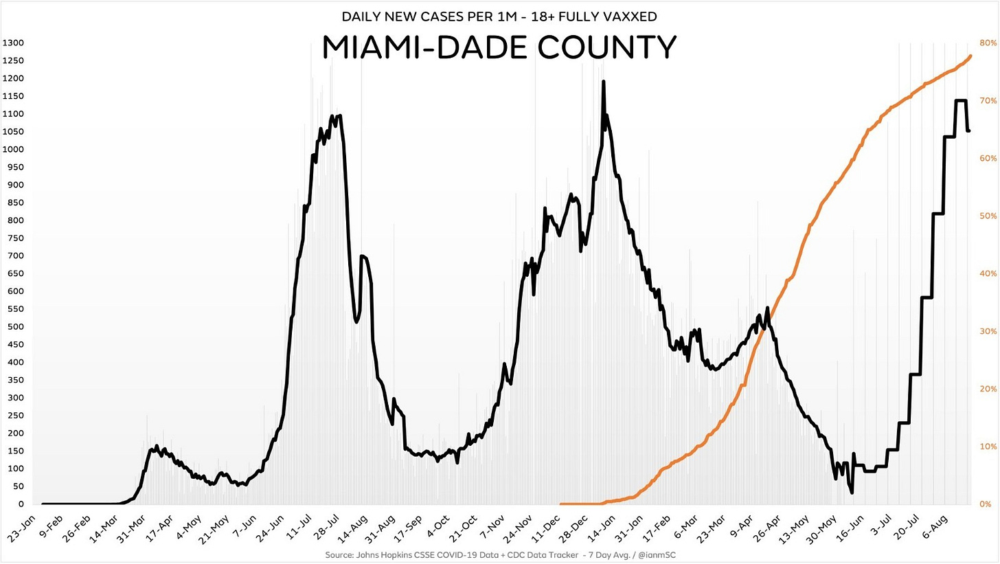 we’re heading into the seasonal surge for california. it’s going to crash into layoffs if they don’t knock this off and if the evidence from heavily vaxxed miami-dade is anything to go by, vaccination rates are not going so help. (data from gatopal @ianmSC.) cases per million plotted vs % vaccinated (orange line, right scale)