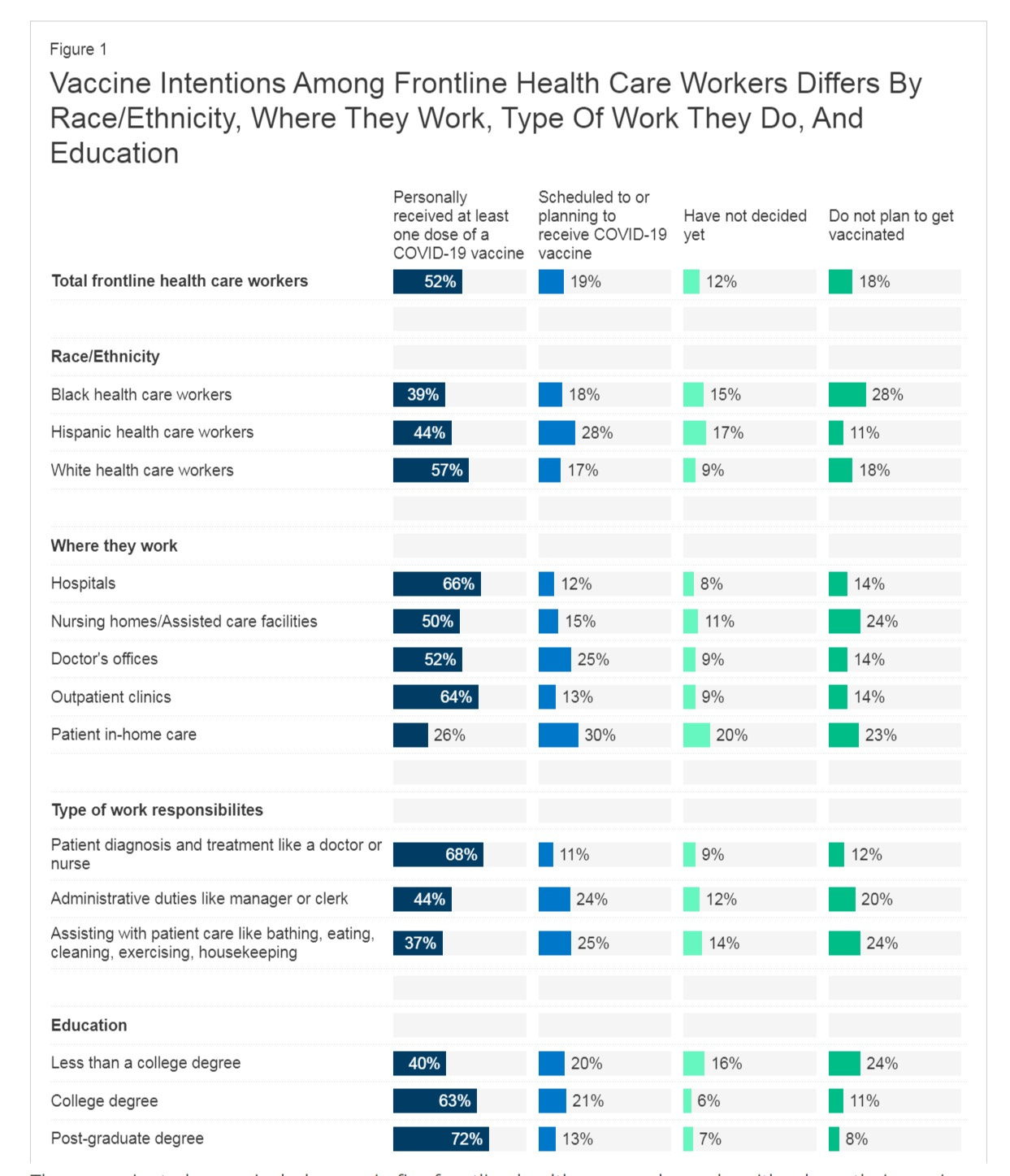 18% of front line HCW’s did not plan to get vaccinated. 14% of overall hospital workers (interesting that front line are more vaccine averse than backoffice) and a whopping 24% of nursing home staff.