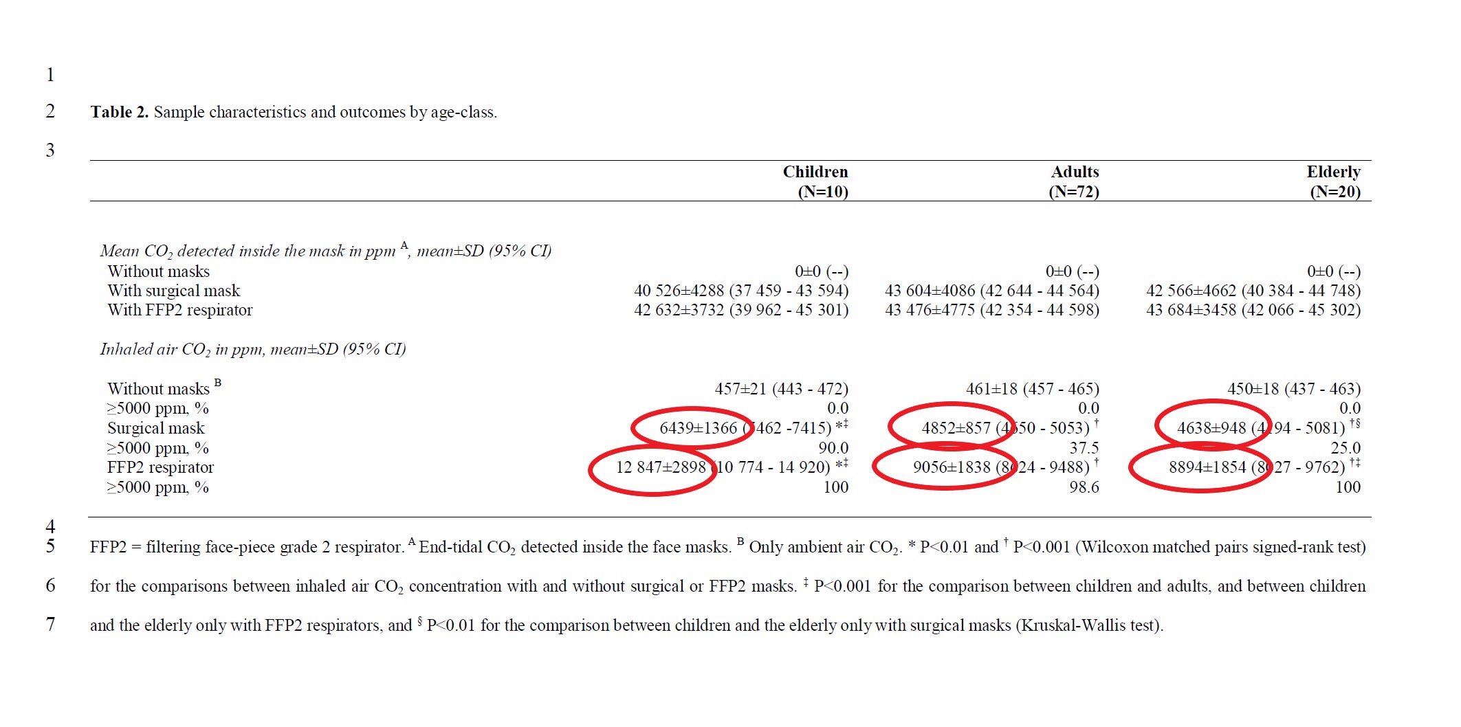 FFP2’s caused much higher CO2 than surgical masks and severely exceeded 5k in all age groups.