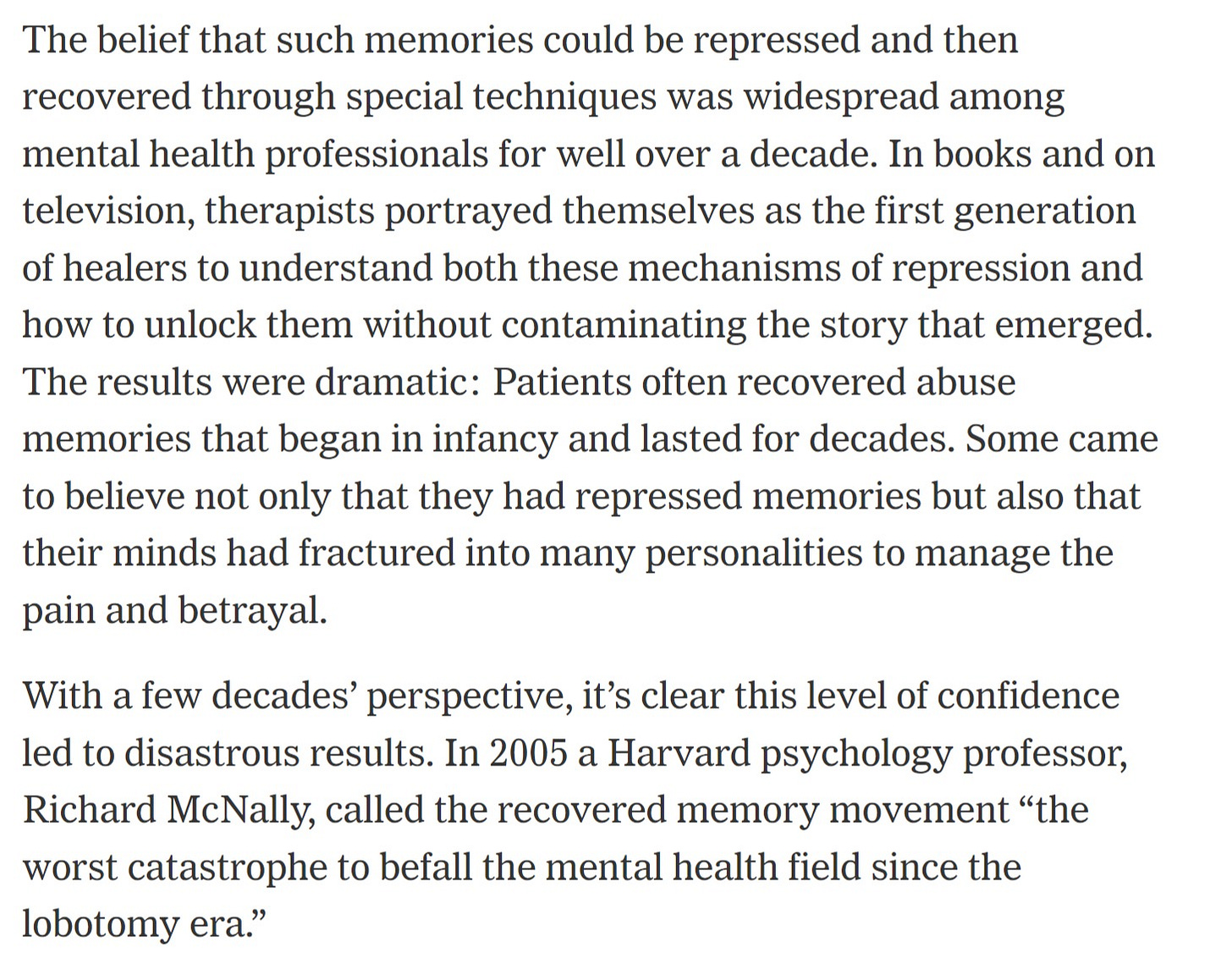 “In 2005 a Harvard psychology professor, Richard McNally, called the recovered memory movement “the worst catastrophe to befall the mental health field since the lobotomy era.”