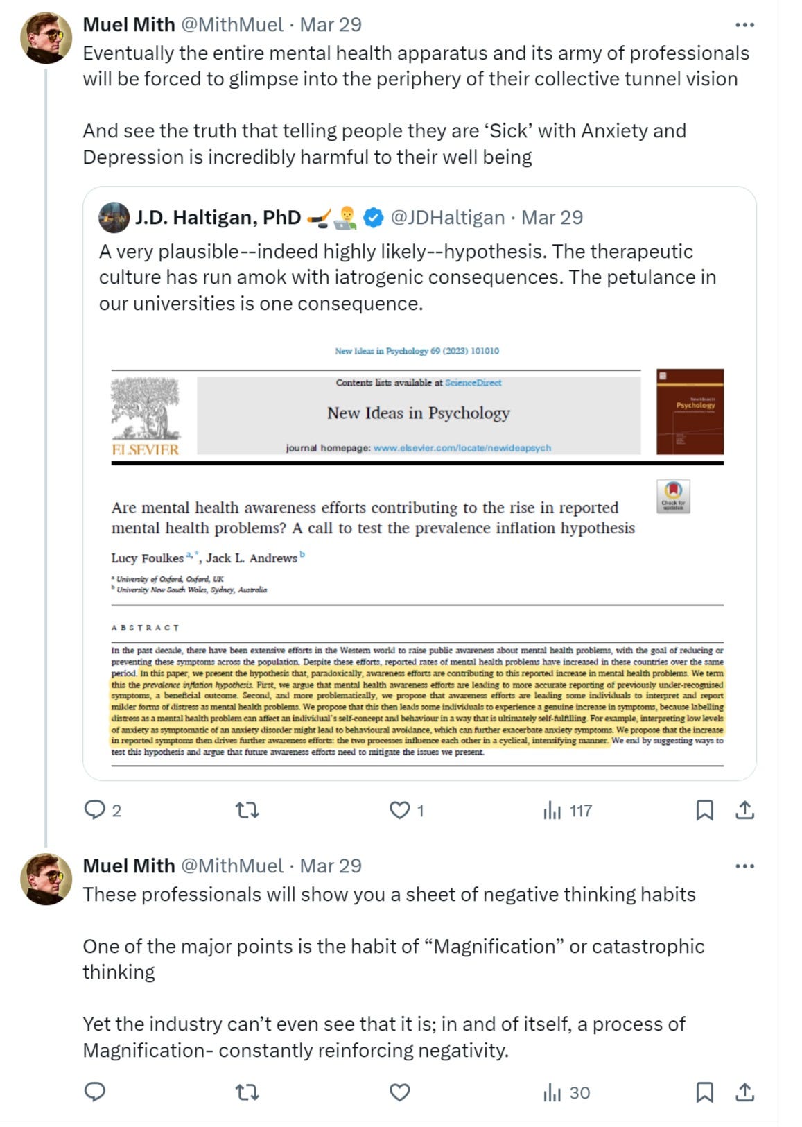 around basic issues of mental well being, being told “you are ill, it’s not your fault” is worse than a wubbie or a crutch, it’s actual harm. it tells you there is something wrong with you and increasingly vilifies and stigmatizes the absolutely totally normal. it makes you into a mark. worse, it makes you into a “repeat customer” and you want to be seriously circumspect on that one.