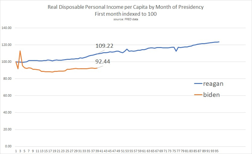 the data goes through march 2024, so i compared the first 39 months of the biden presidency to the first 39 of the reagan presidency by setting the first month of each to 100 and then measuring change.