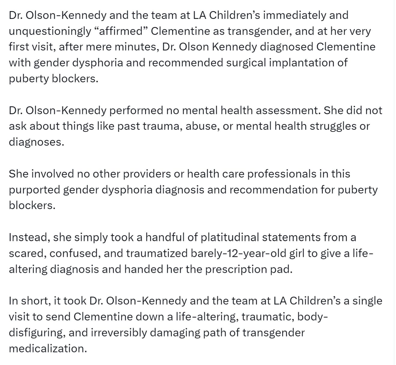 None of the above was discussed or explained in Clementine’s case. In fact, the opposite occurred. Defendants obscured and concealed important information and failed to disclose the significant health risks associated with a female taking high doses of harmful male hormone drugs and puberty blockers.